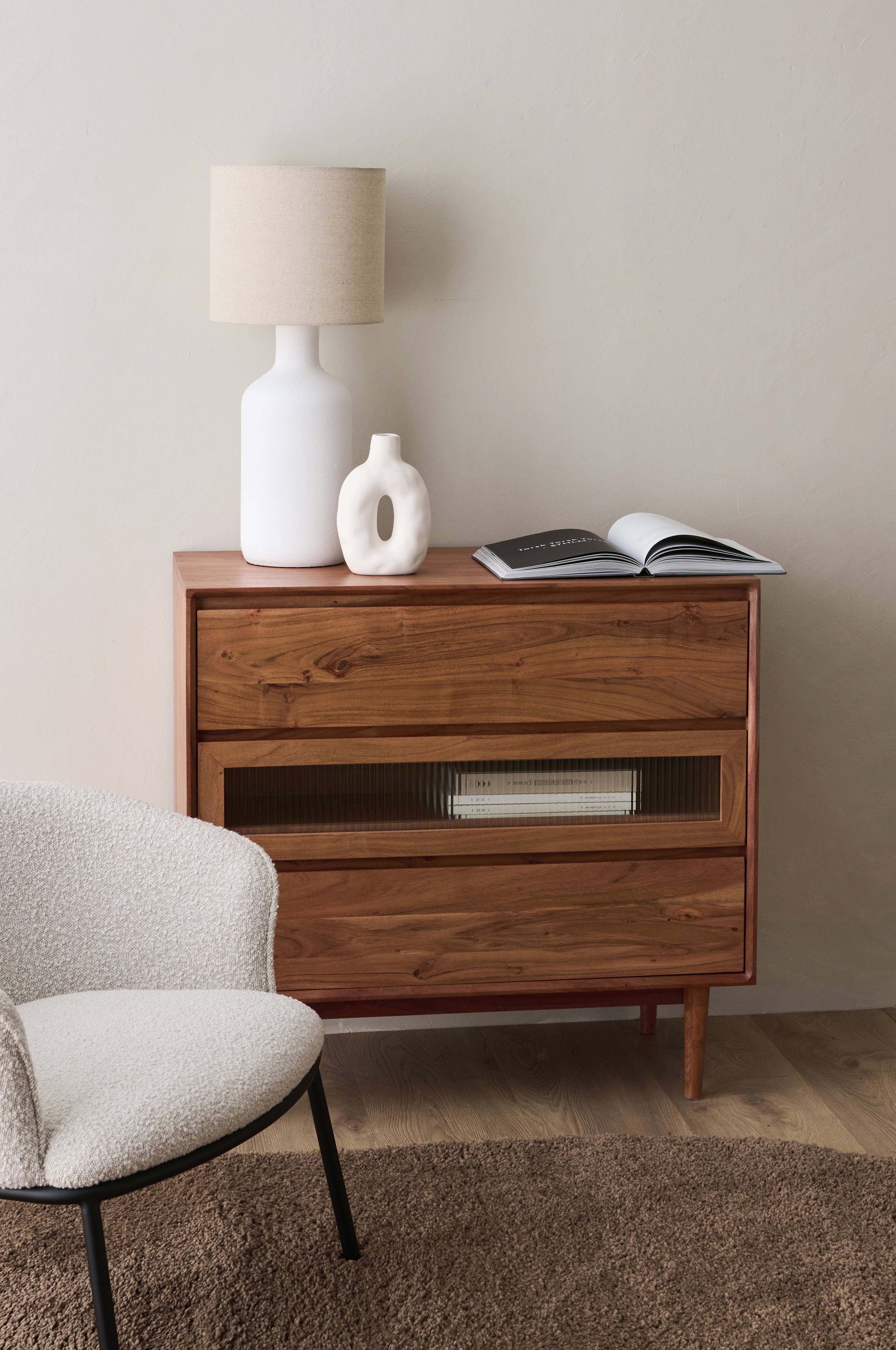Kommode af akacietræ. Tre skuffer med skuffestop, hvoraf en har en front i hærdet glas med rillet mønster. Frihøjde under møbel 15 cm. Leveres usamlet.
