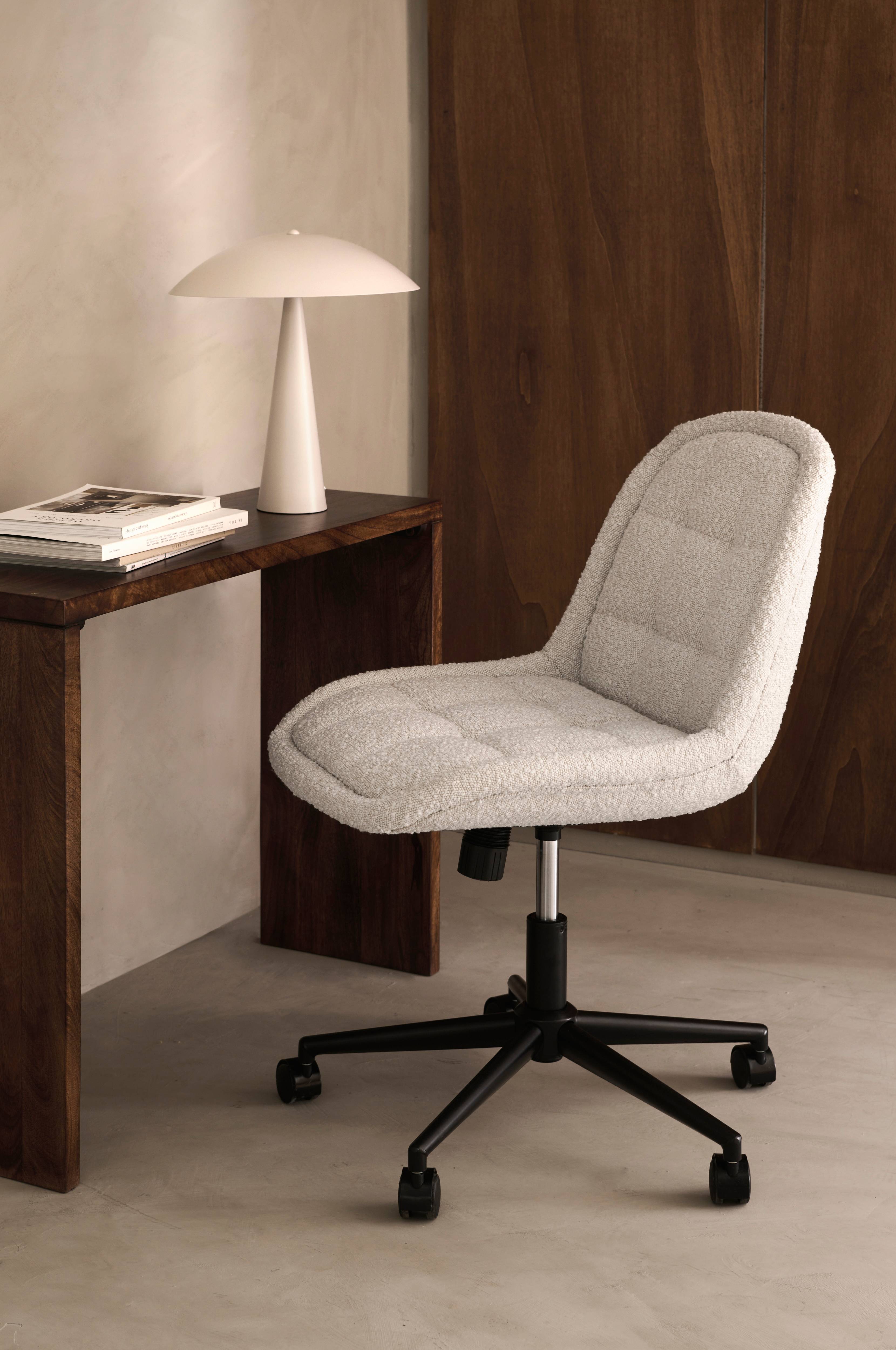 Kontorstol/skrivebordsstol med vatteret sæde og betræk i boucléstof. Ben i pulverlakeret metal med hjul. Vippemekanisme og drejefunktionsplade.