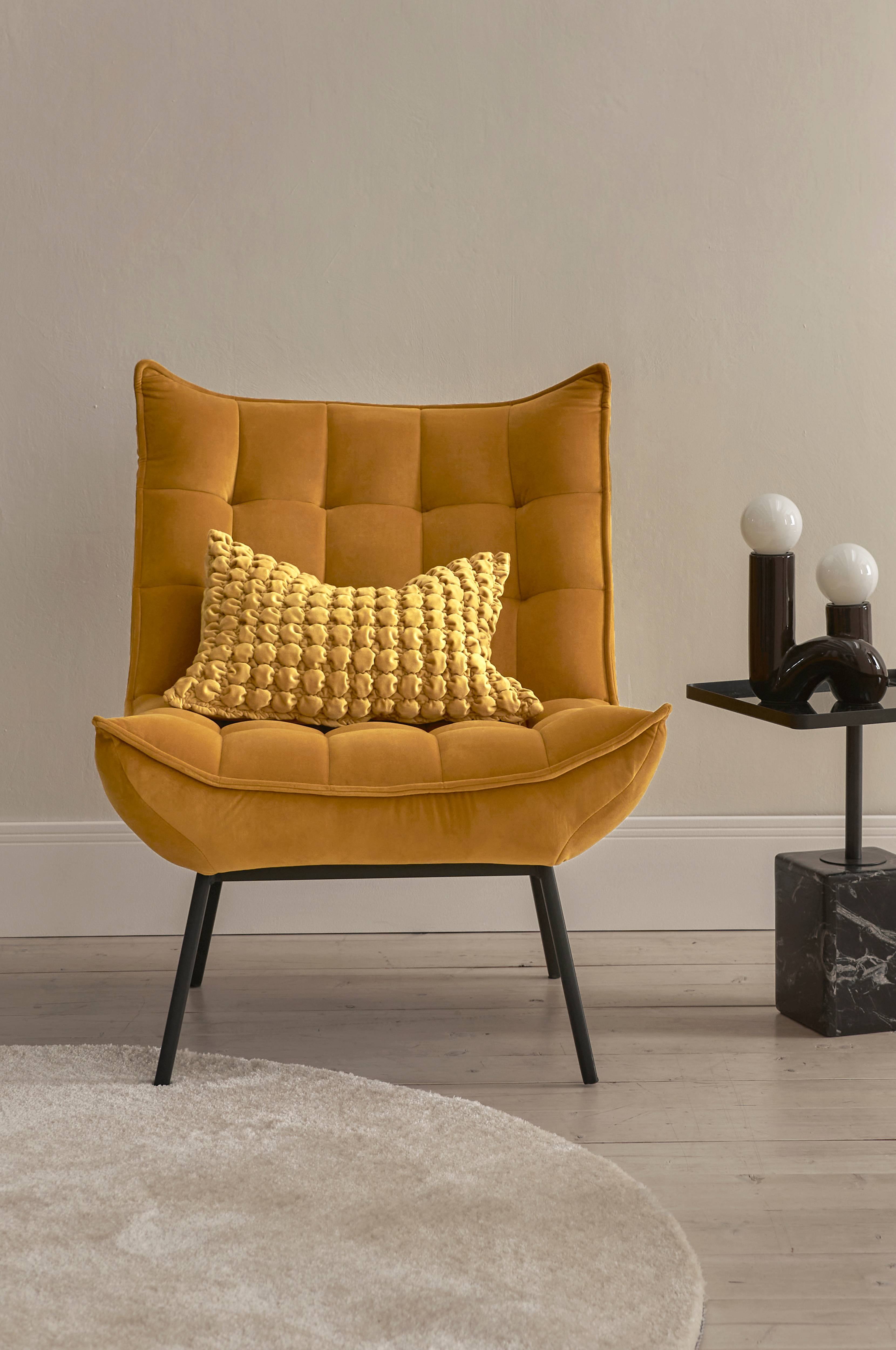 Lænestol med paspoleret kant rundt om. Indfældninger, der danner et dekorativt ternet mønster. Skumfyld. Ben af metal. Lettere samling.
