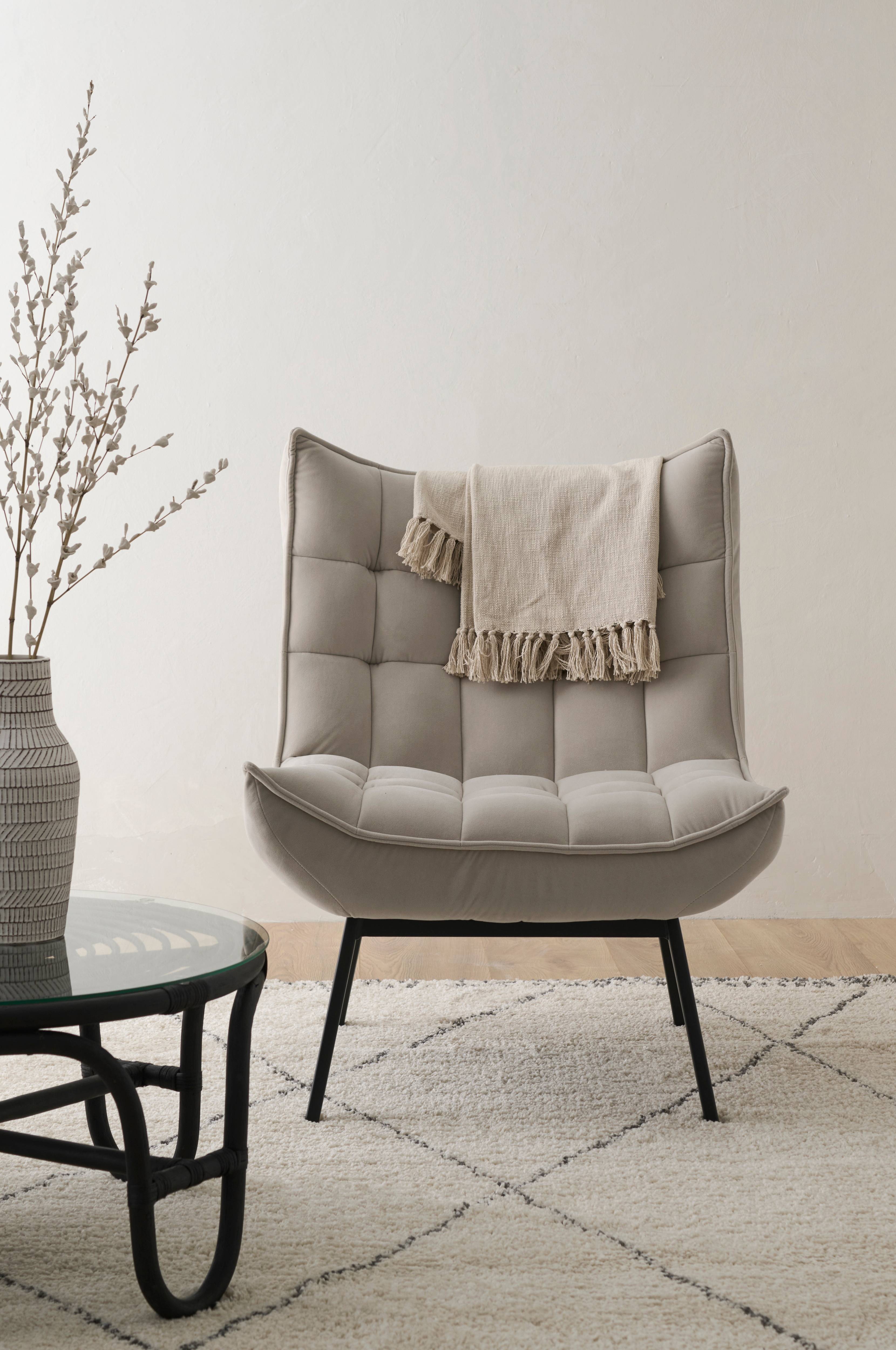 Lænestol med paspoleret kant rundt om. Indfældninger, der danner et dekorativt ternet mønster. Skumfyld. Ben af metal. Lettere samling.