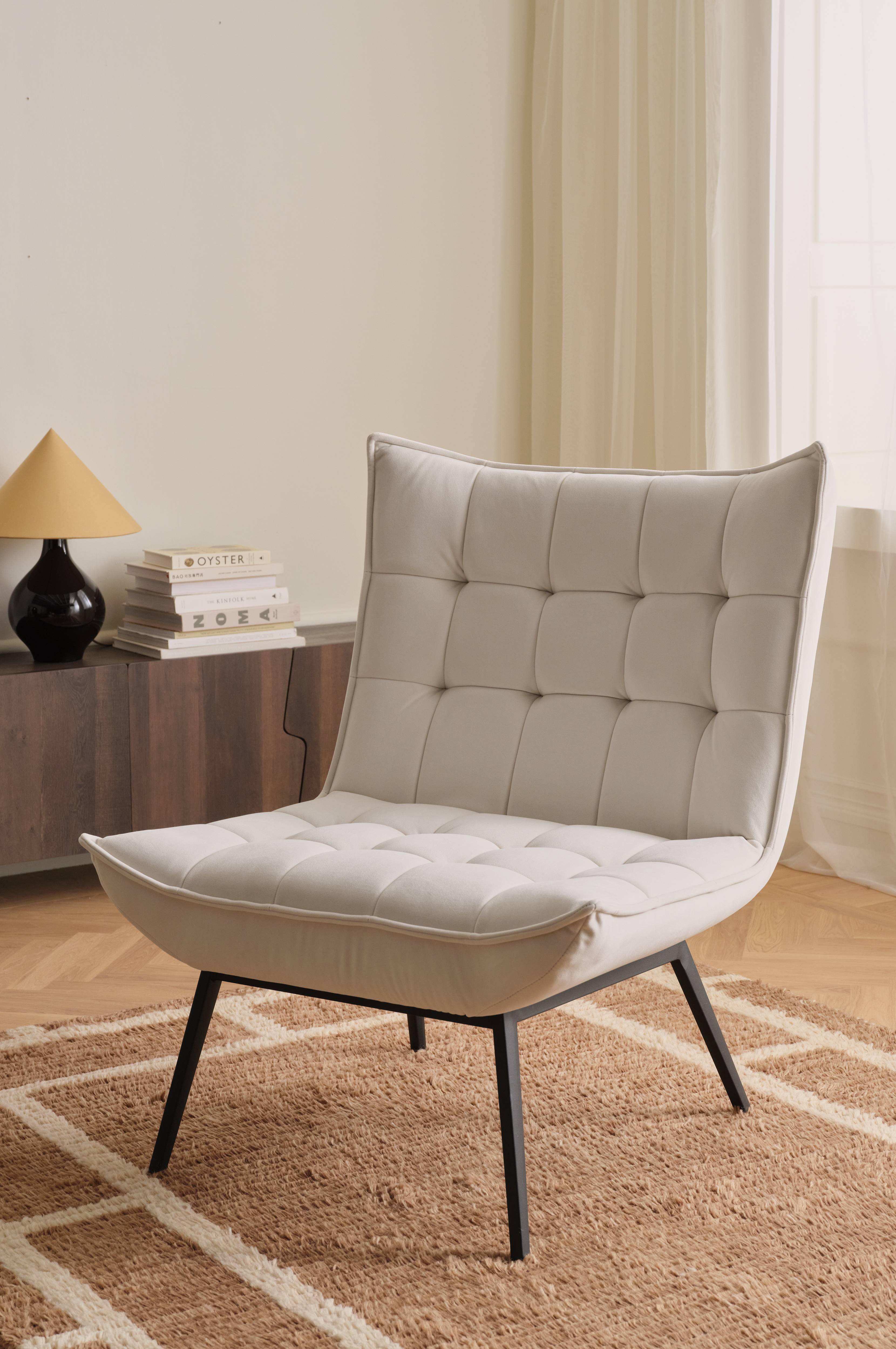 Lænestol med paspoleret kant rundt om. Indfældninger, der danner et dekorativt ternet mønster. Skumfyld. Ben af metal. Lettere samling.