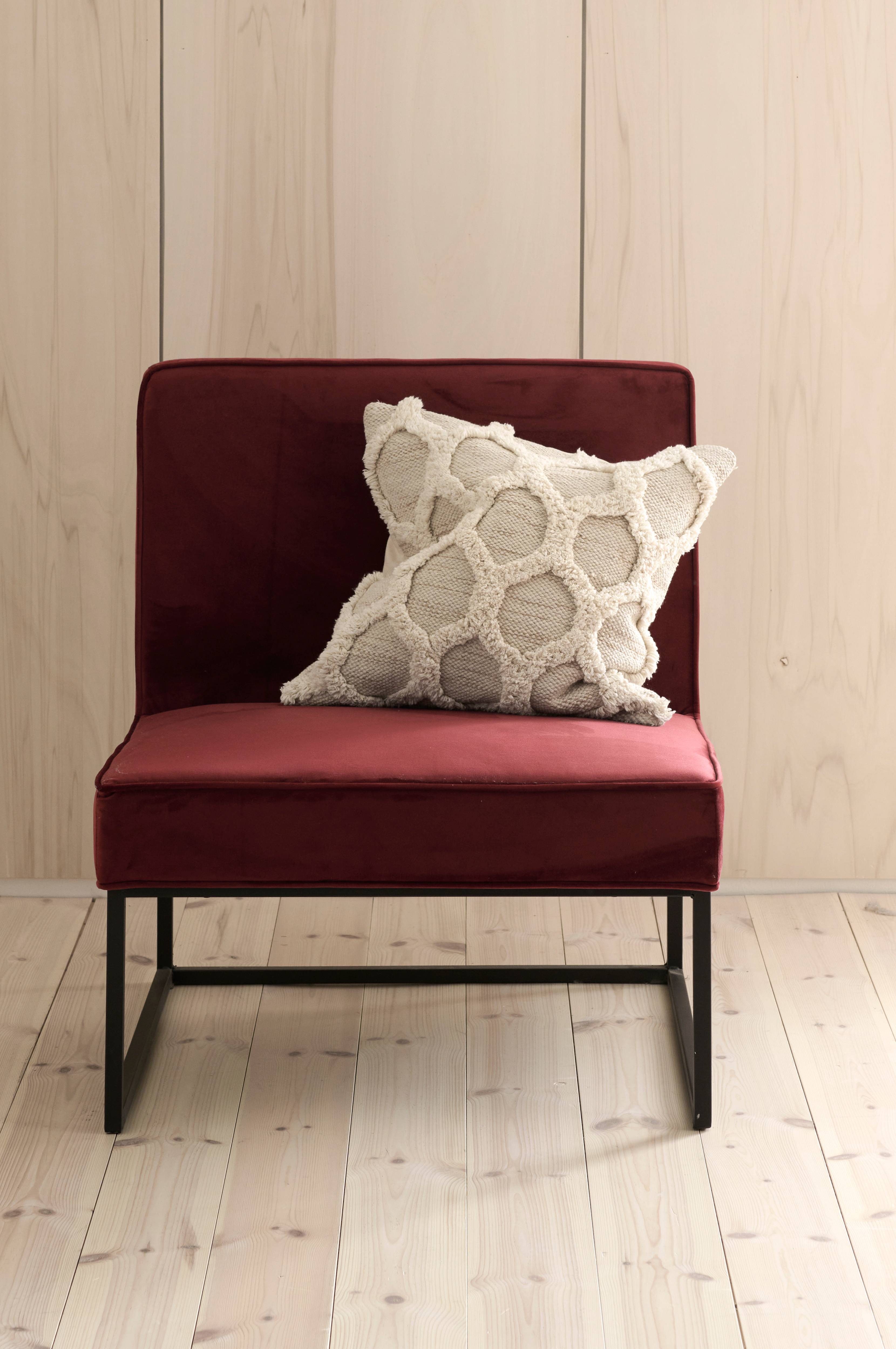 Stabil, bred lænestol med metalstel. Betræk af blød polyestervelour og fyld af polyeter. Gummibånd i sædet. Højde 84 cm, bredde 75 cm, dybde 79 cm. Siddehøjde 43 cm, siddedybde 57 cm. Monteret.