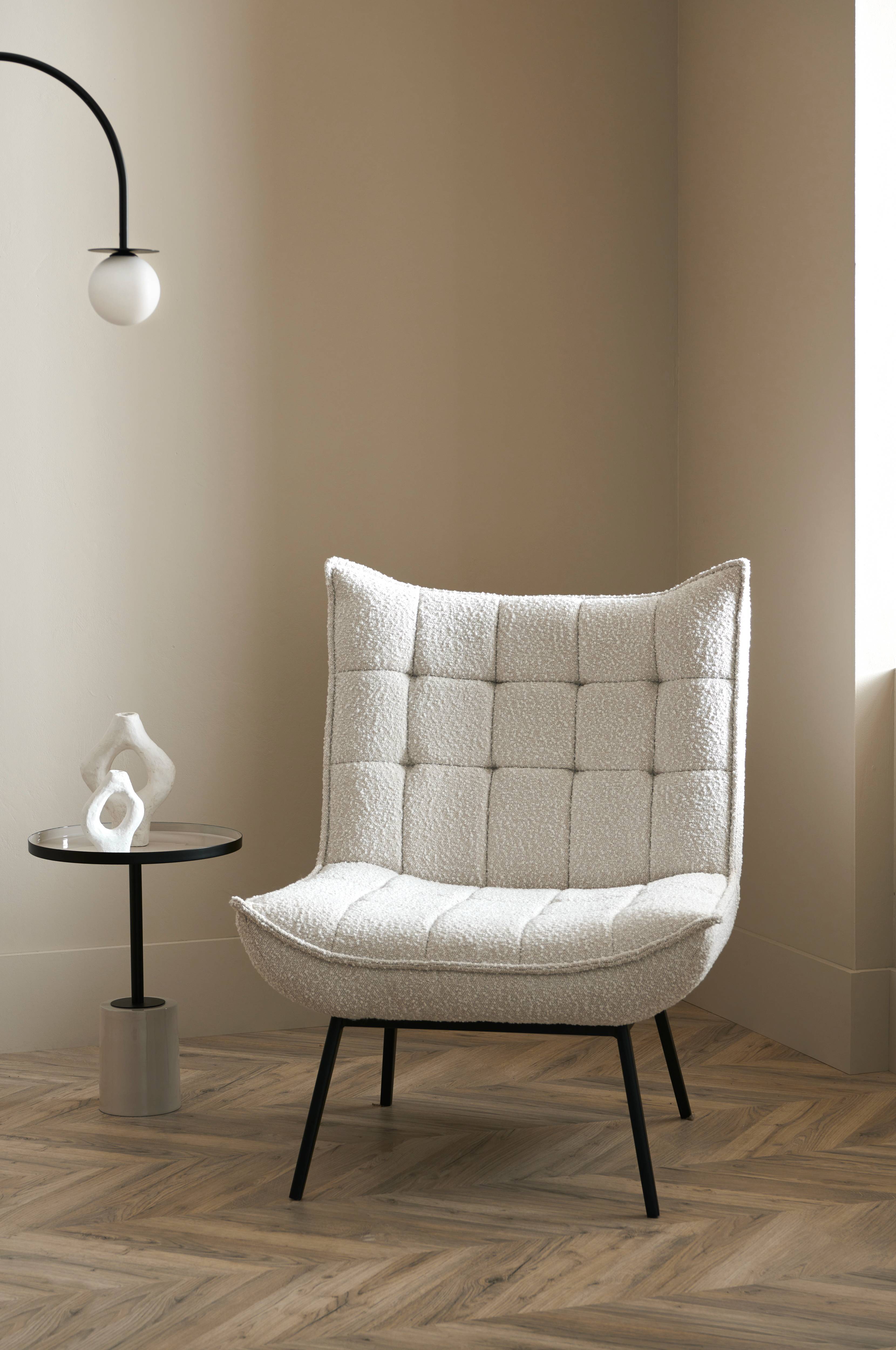 Lænestol med paspoleret kant rundt om. Betræk i bouclé med indfældninger, der danner et dekorativt ternet mønster. Skumfyld. Ben af metal. Lettere samling.