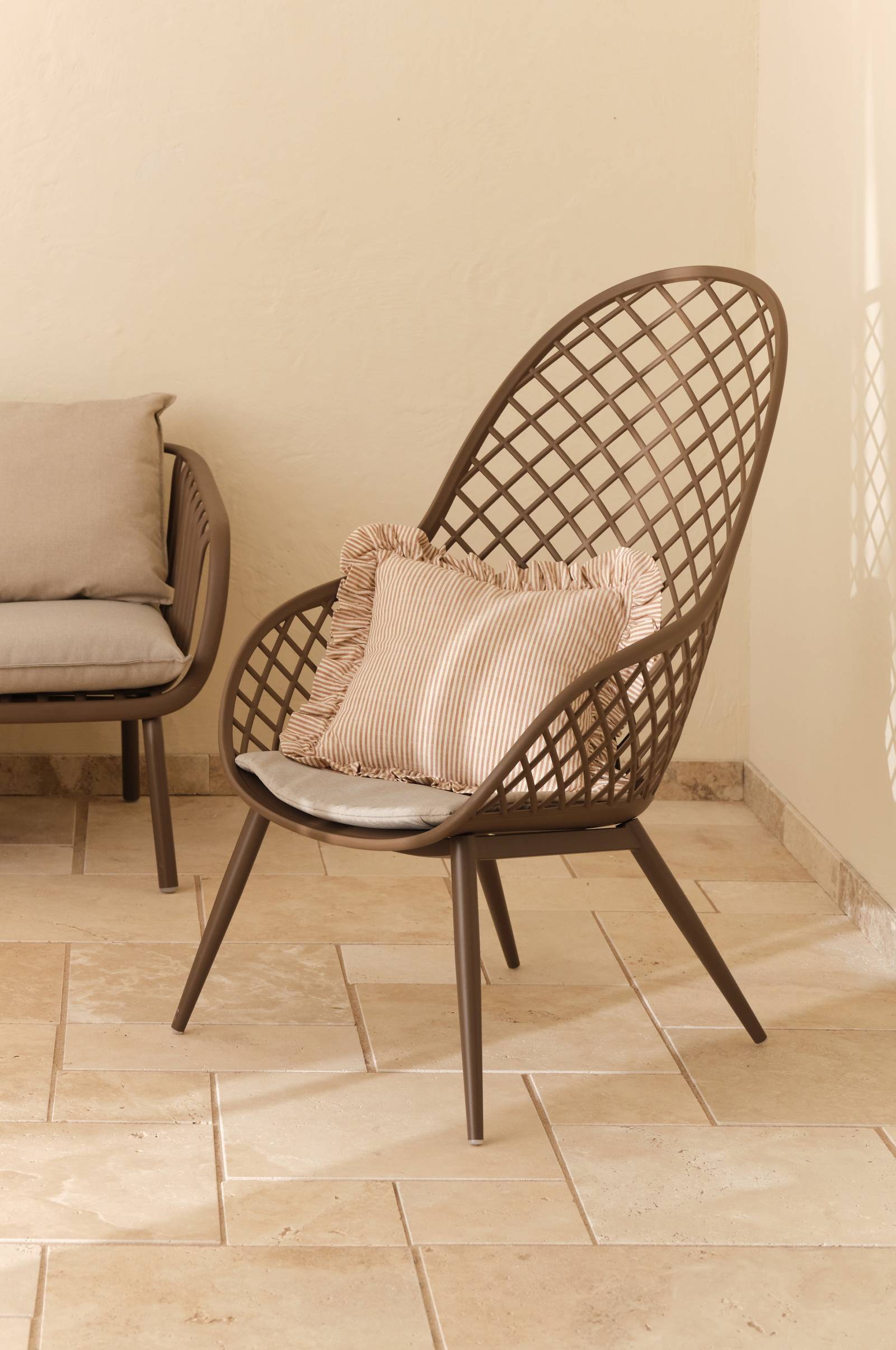 • Loungestol i vejrbestandig polypropylen• Inklusiv pude med Skumfyld• Bøjet, flettet rygstøtte• Pulverlakerede ben i metal