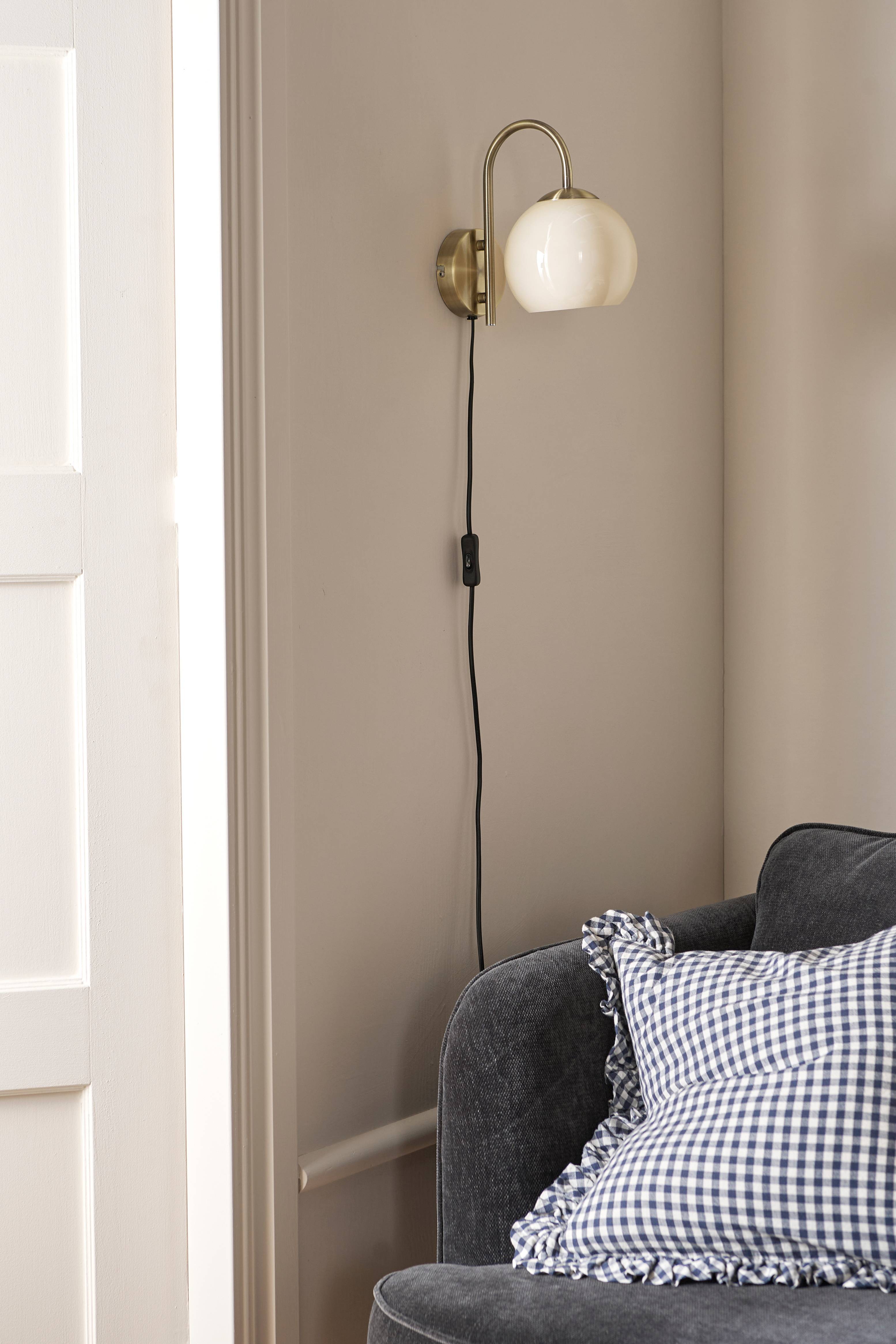 • Messingfarvet væglampe i metal• Skærm i glas med åbning nederst• Plastledning med kontakt• Lampeskærmens diameter: 15 cm• Pære medfølger ikke