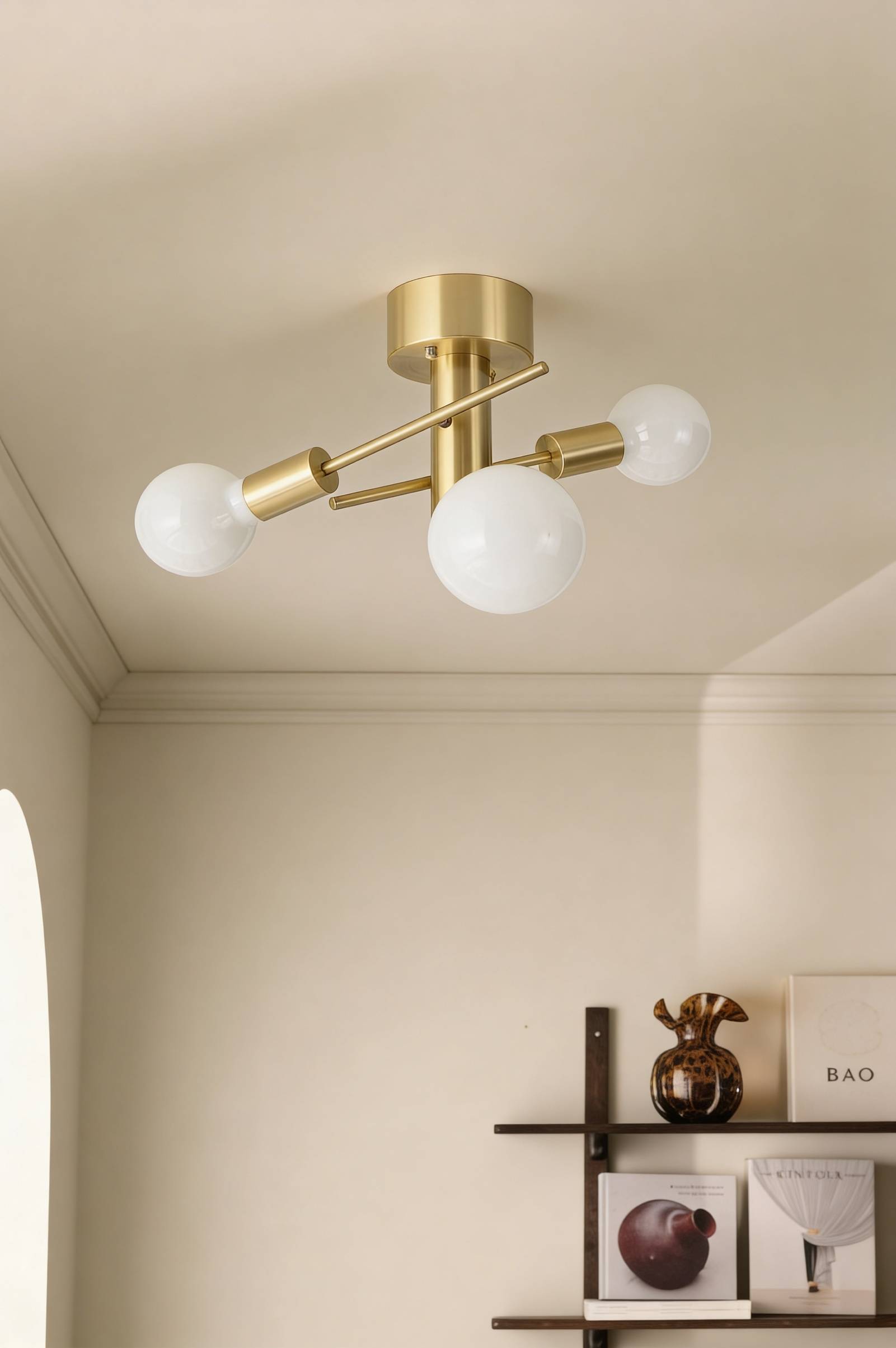 Loftlampe/loftplafond i metal med 3 faste arme. Længde pr. arm 27,5 cm. Samlet højde fra loft ca. 23 cm. Diameter i alt 37 cm. Baldakin af metal, diameter 12 cm x højde 6 cm. Monteres med loftbøjle. Sokkel 3 x E27. Maks. 25 W.