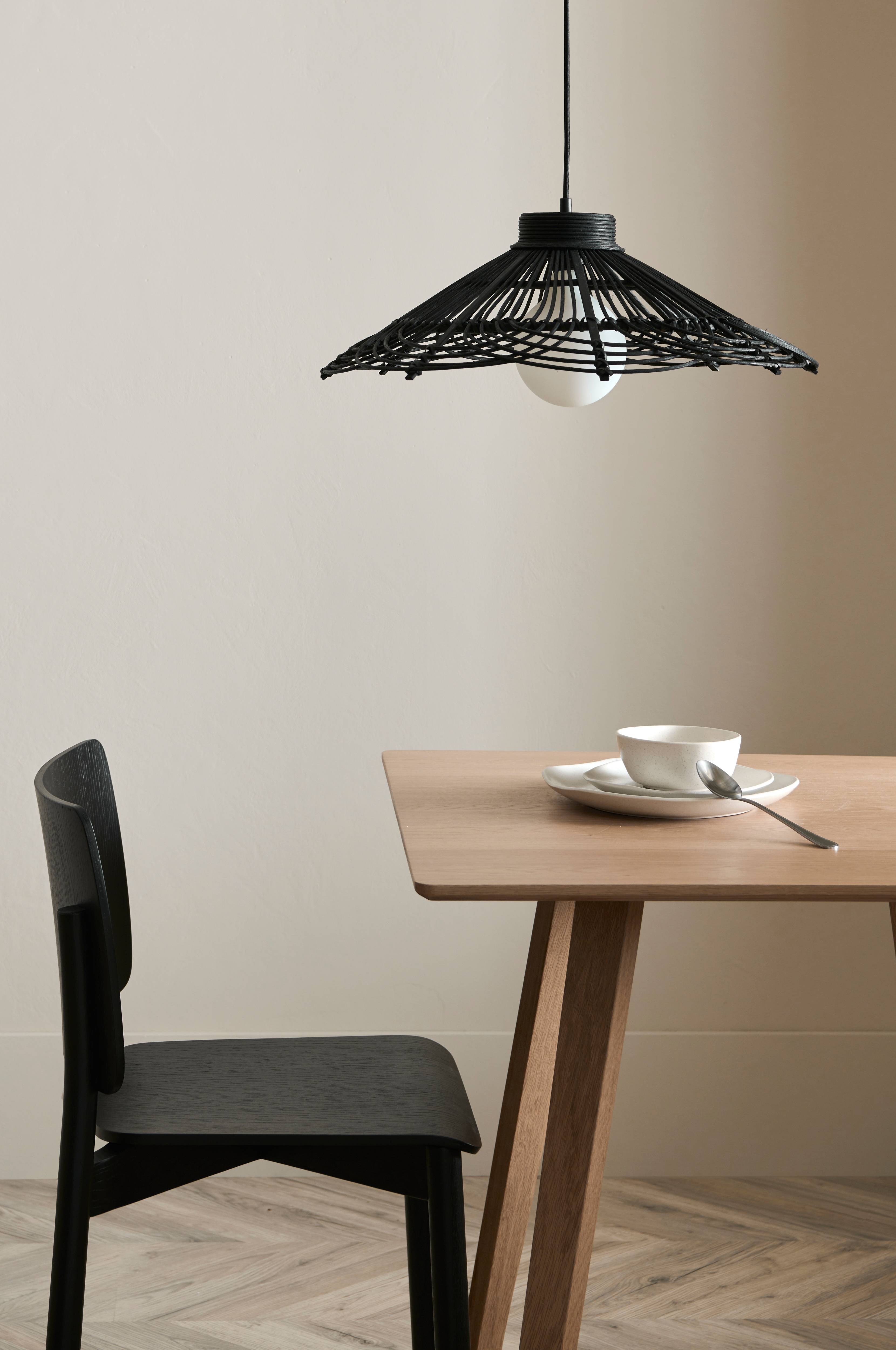 Håndlavet loftlampe med skærm i farvet rotting. Sort baldakin i plast. Sort stofledning. Samlet højde fra loft ca. 137 cm, kan afkortes til ønsket højde. Pære medfølger ikke. Dette produkt er håndlavet og af naturmateriale, hvilket gør at små variationer i nuance og størrelse kan forekomme.