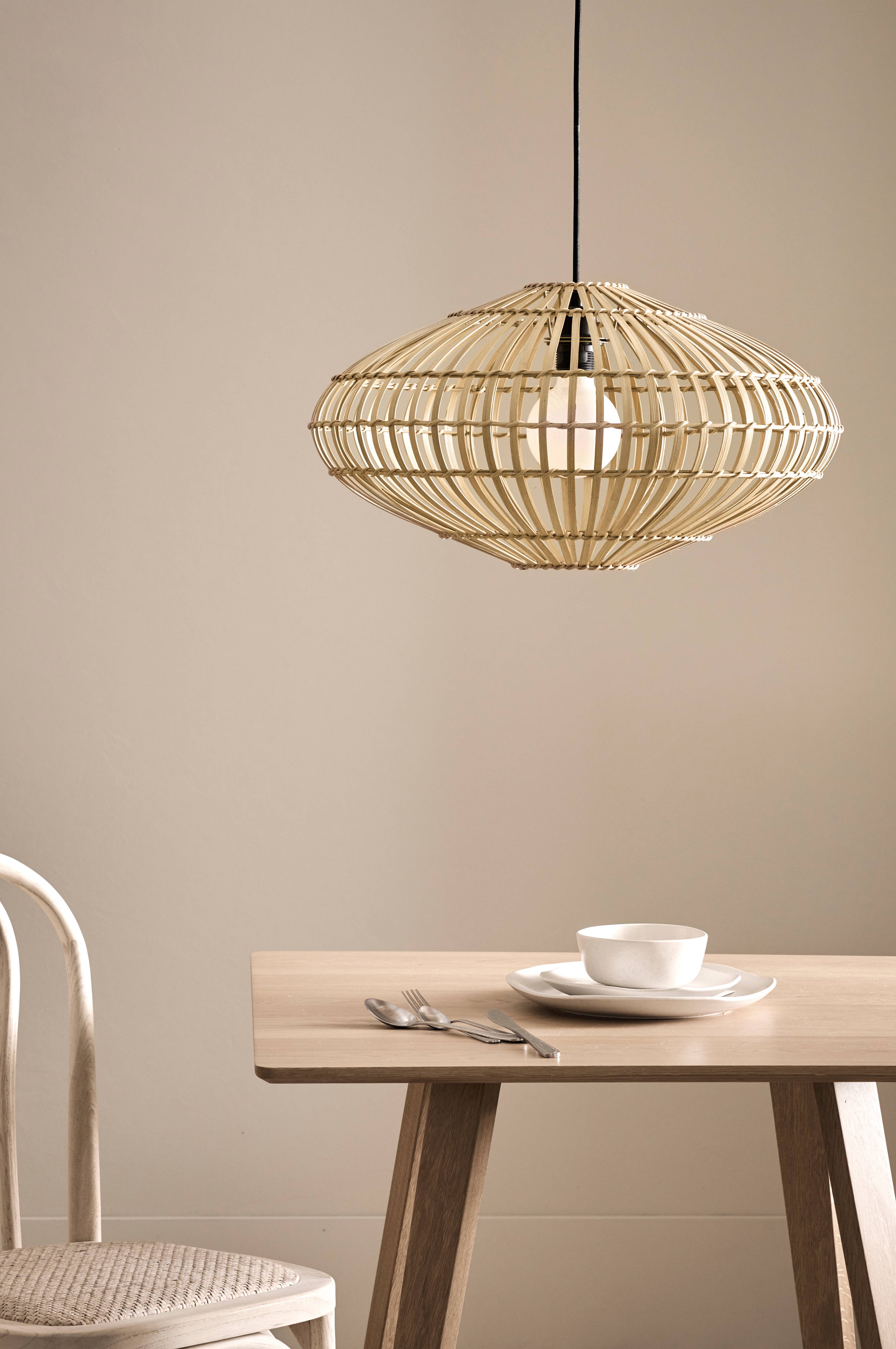 Loftlampe med skærm i naturfarvet bambus. Sort ledning og sort baldakin i plast. Samlet højde ca. 160 cm, kan afkortes til ønsket højde. Monteres med krogophæng. Pære medfølger ikke. Ujordet.
