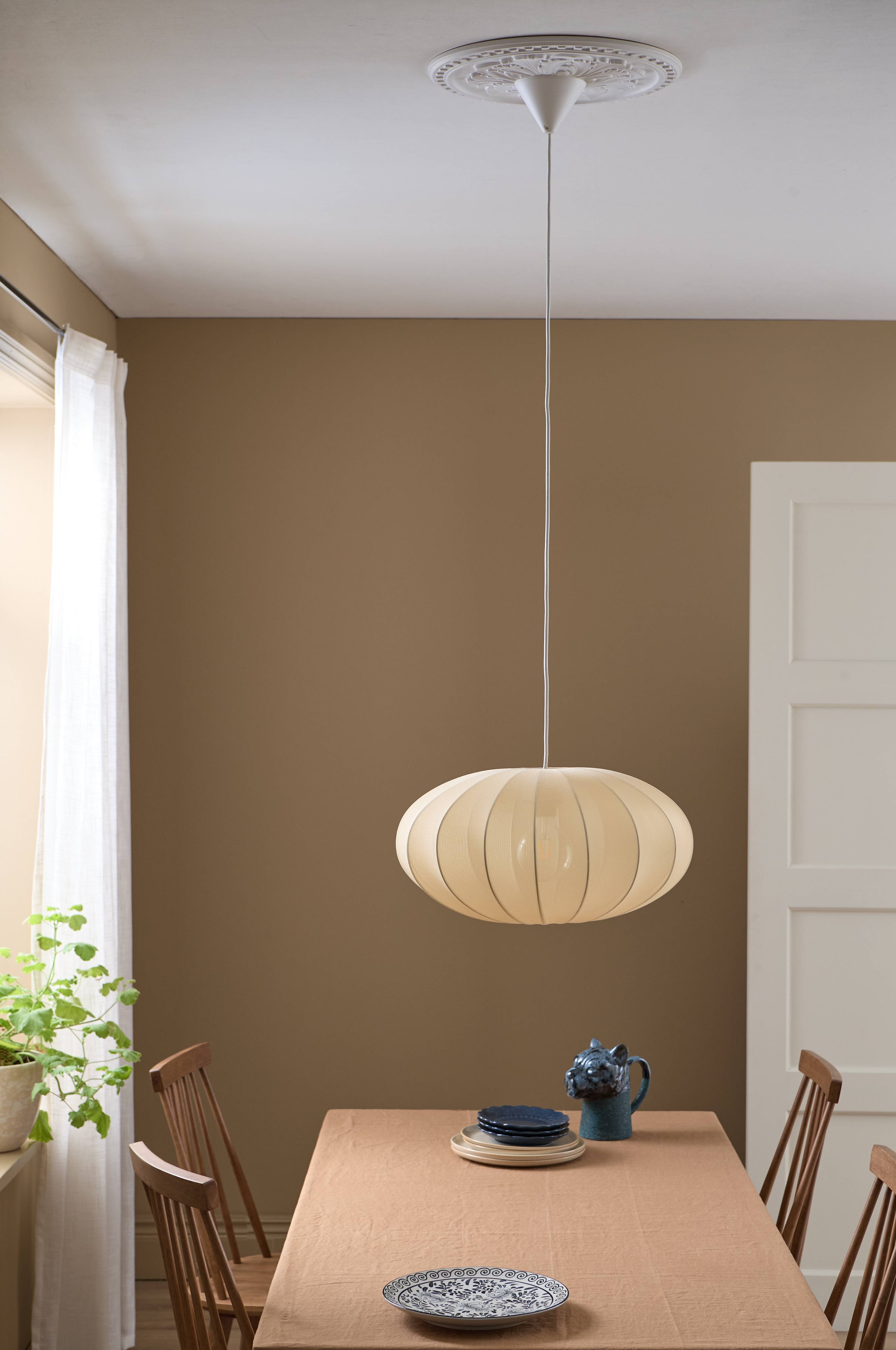 Taklampa 50 cm Ø 25cm H . Skærme i beige gaze stof 87% nylon 13% spandex. Skärmens ställning av stål .Takoppen i plast. Vit lamphållare i stål 1x E27. Max 5W. Vit justerbar 1,2 m L textilkabel. krokupphägning. Ljuskälla ingår ej. jordad. Netto vægt 1,3 kg.