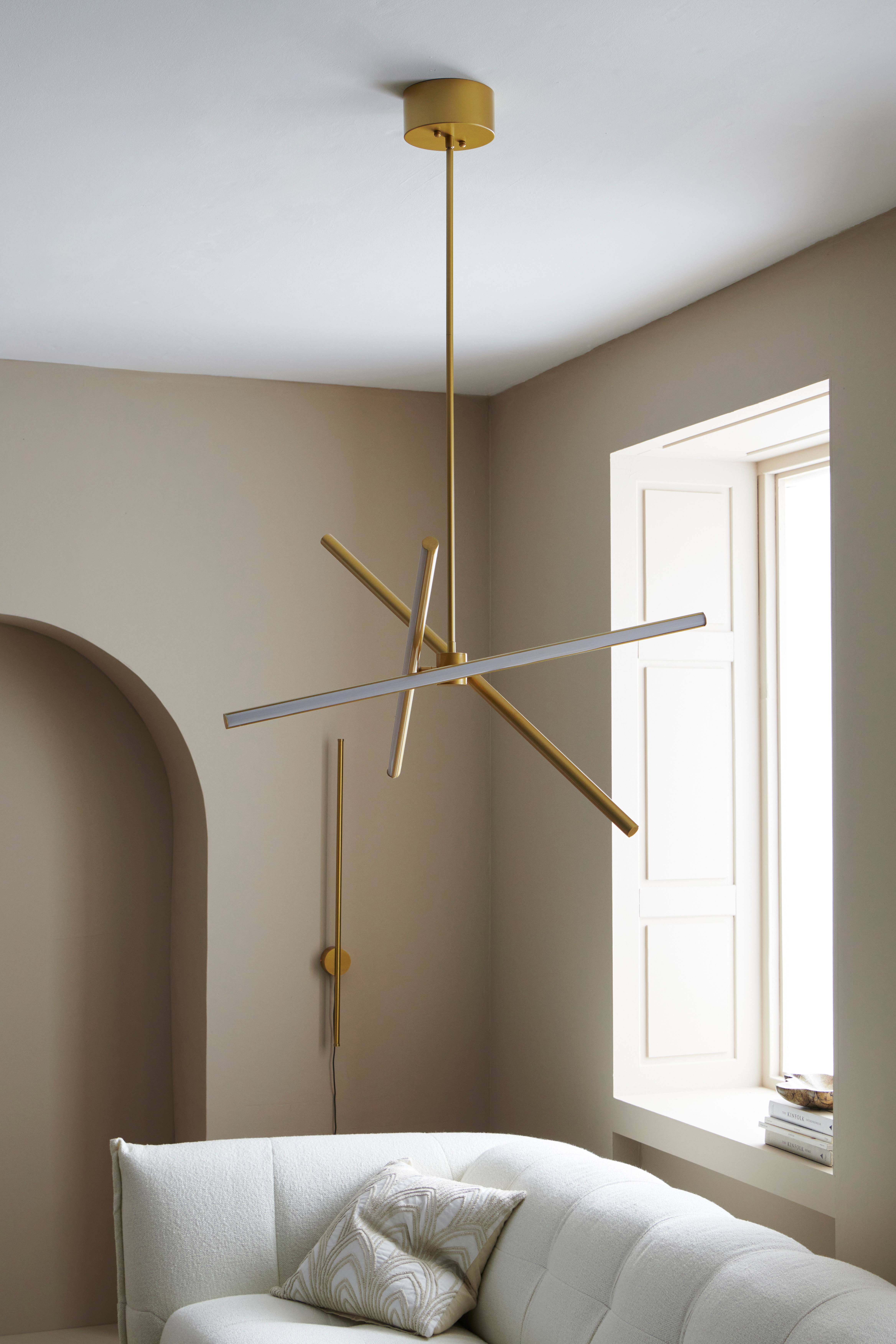 Loftlampe i moderne design. Lavet af metal med messingfinish og detaljer i akryl. 3 integrerede LED-pærer. Loftlampen er dæmpbar og kan anvendes i kombination med en egnet vægdæmper som er installeret i dit hjem. 3 arme som kan vinkles. Armenes længde 80 cm. Jordet.