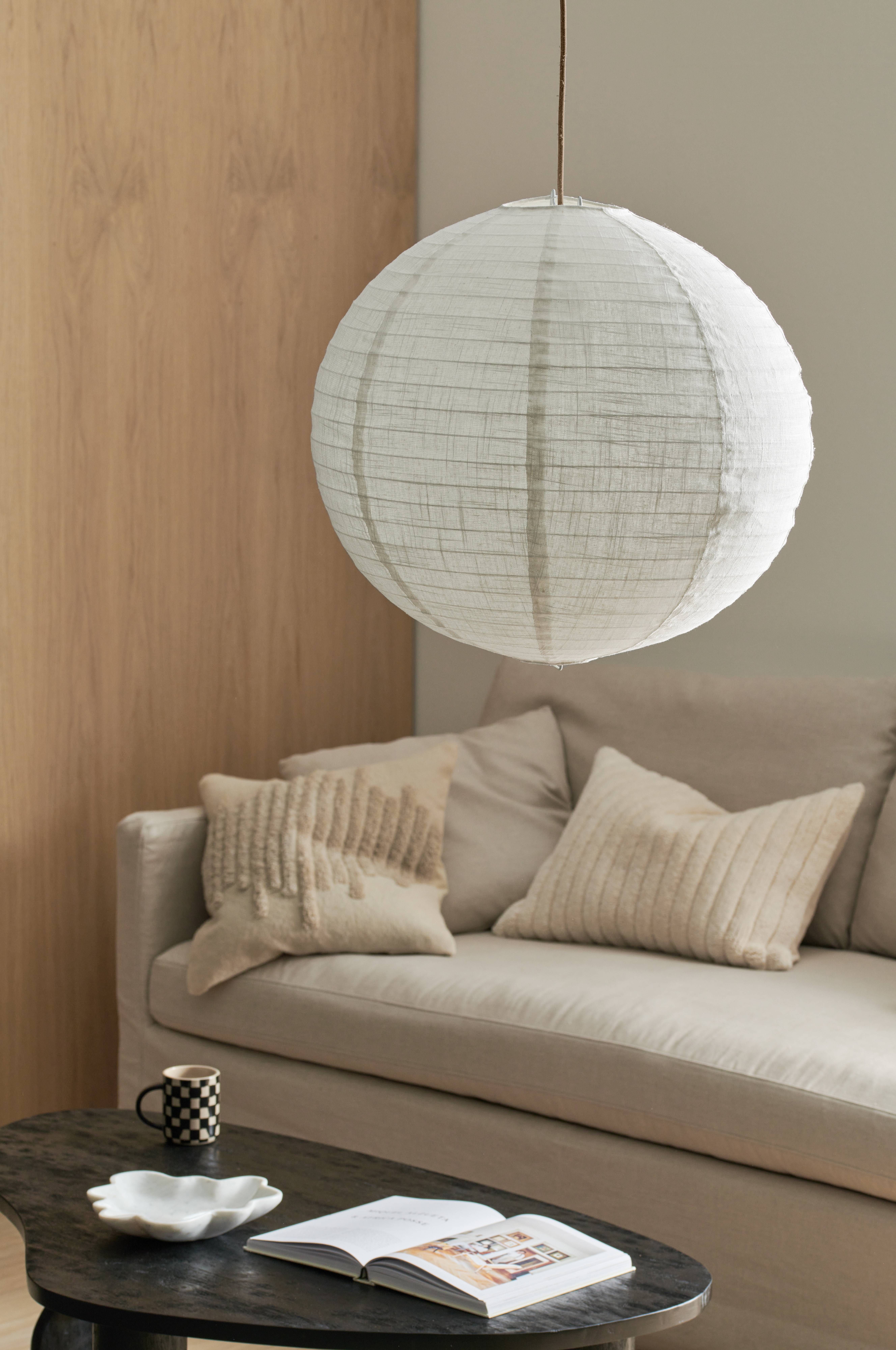 Loftskærm med strukturtekstil og riskonstruktion som giver et smukt lys. Skærmen har et indvendigt metalstel. Form metalrammen, når du monterer skærmen, så den får en rund form.Loftophæng og pære medfølger ikke.