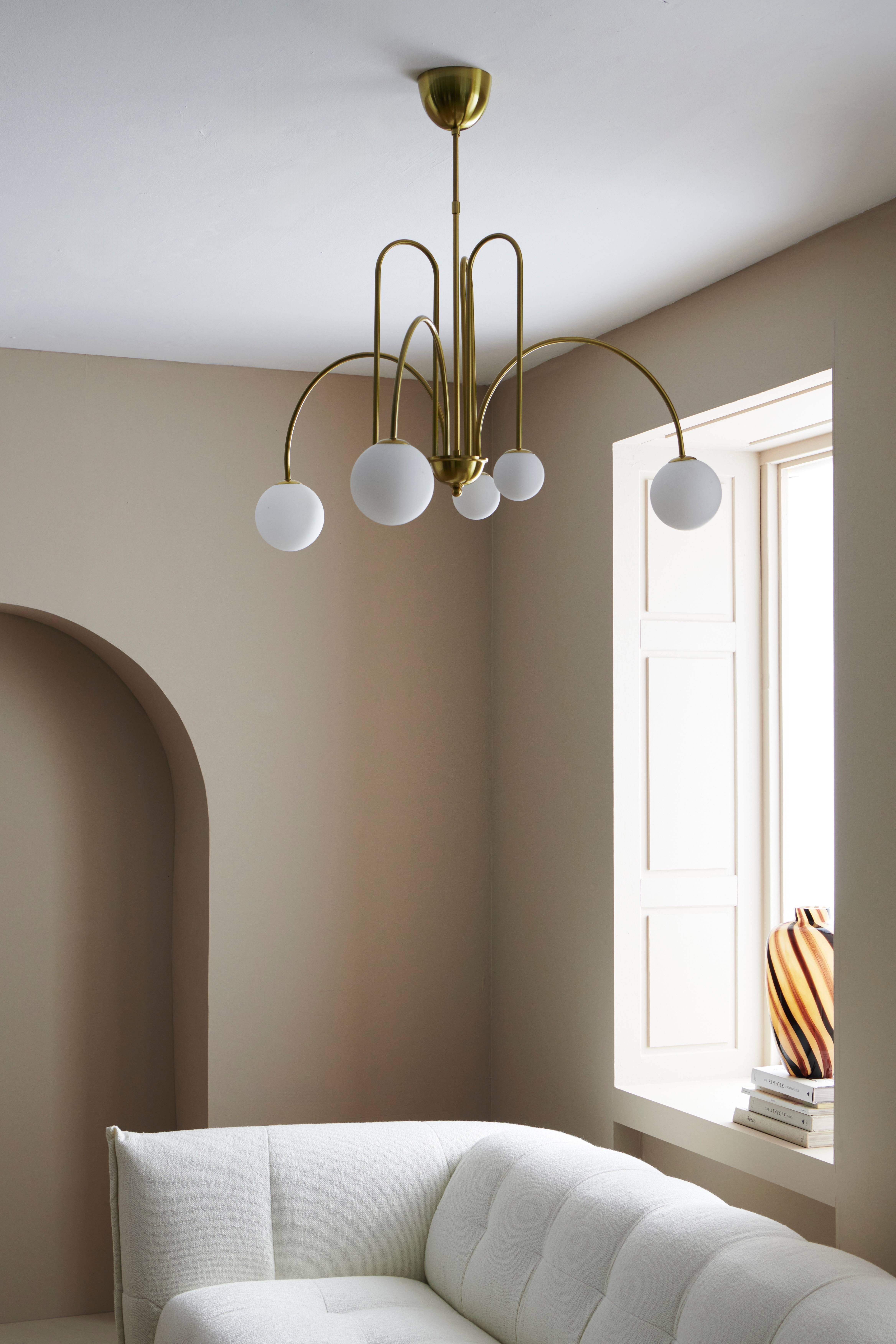 • Loftslampe i metal med messingfinish • Loftskål i metal • 6 skærme/glaskupler i 2 forskellige størrelser • Tagskålens diameter: 12 cm • Glaskuplernes diameter: 3 x 8 cm og 3 x 12 cm • Lyskilder medfølger ikke • Jordhjul • Loftkontakt medfølger ikke pga. nyt EU-direktiv. Loftkontakter kan købes separat.