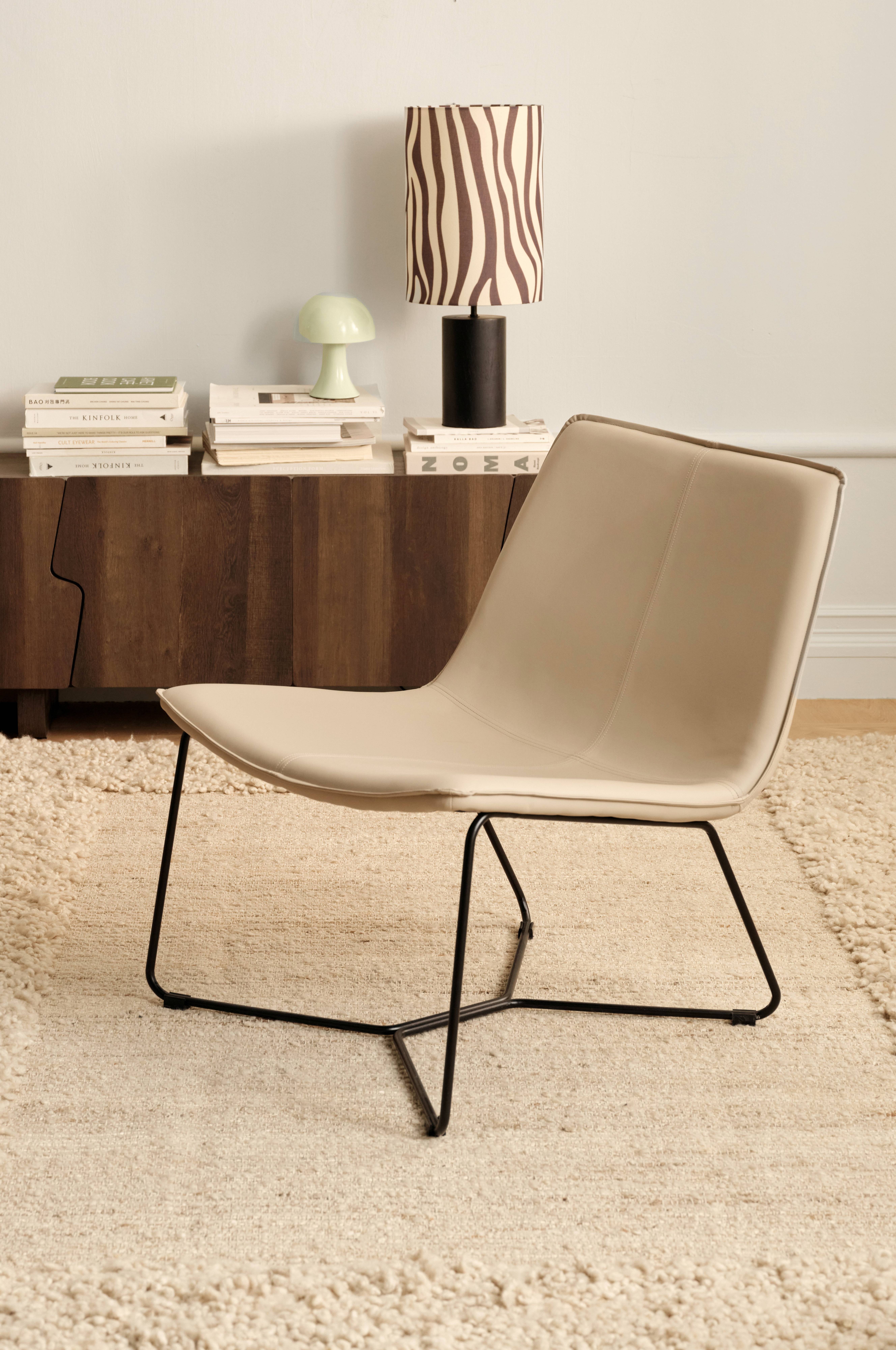Loungestol i PU-læder (imiteret skind) med et levende tone-i-tone-mønster og jeanssøm midt foran på sæde og ryg. Ben af pulverlakeret metal. Skumfyld.