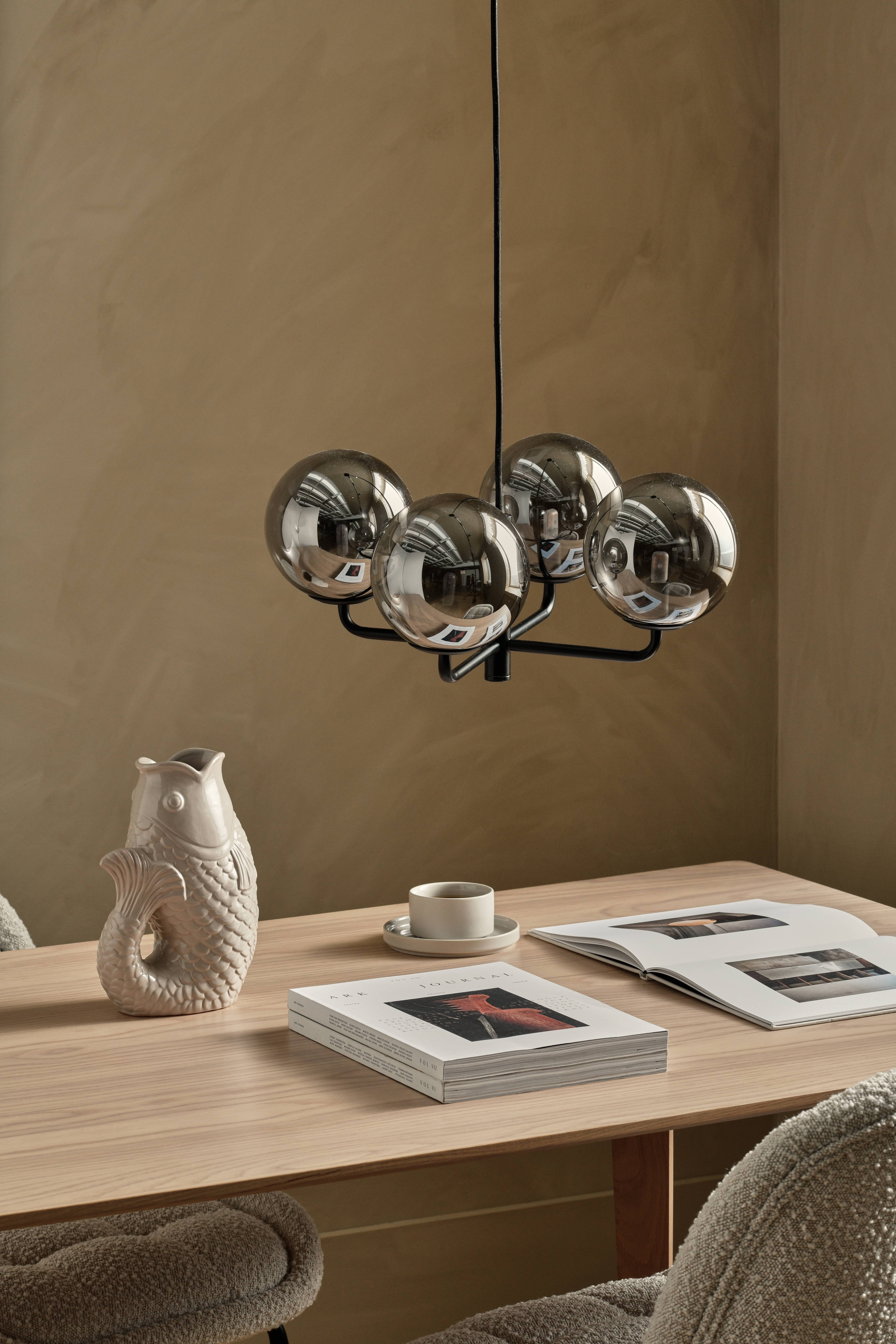 Lysekrone af metal med 4 glasskærme. Samlet højde fra loft ca. 110 cm, kan afkortes til ønsket højde. Glasskærmenes mål: Diameter 15 cm. Sokkel 4xG9. Transparent ledning. Krogophæng.