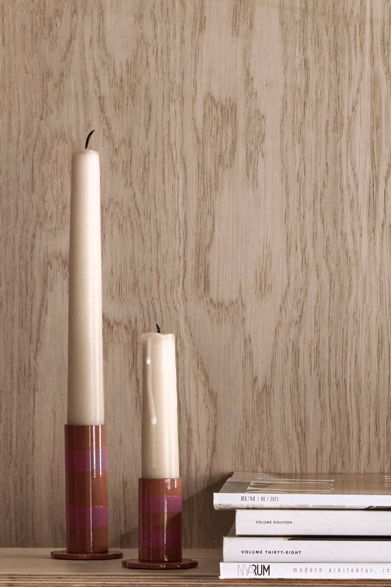 2 lysestager af metal med forskellig højde. Bredde 4,5 cm, dybde 4,5 cm. Højde hhv. 5 cm og 8 cm.