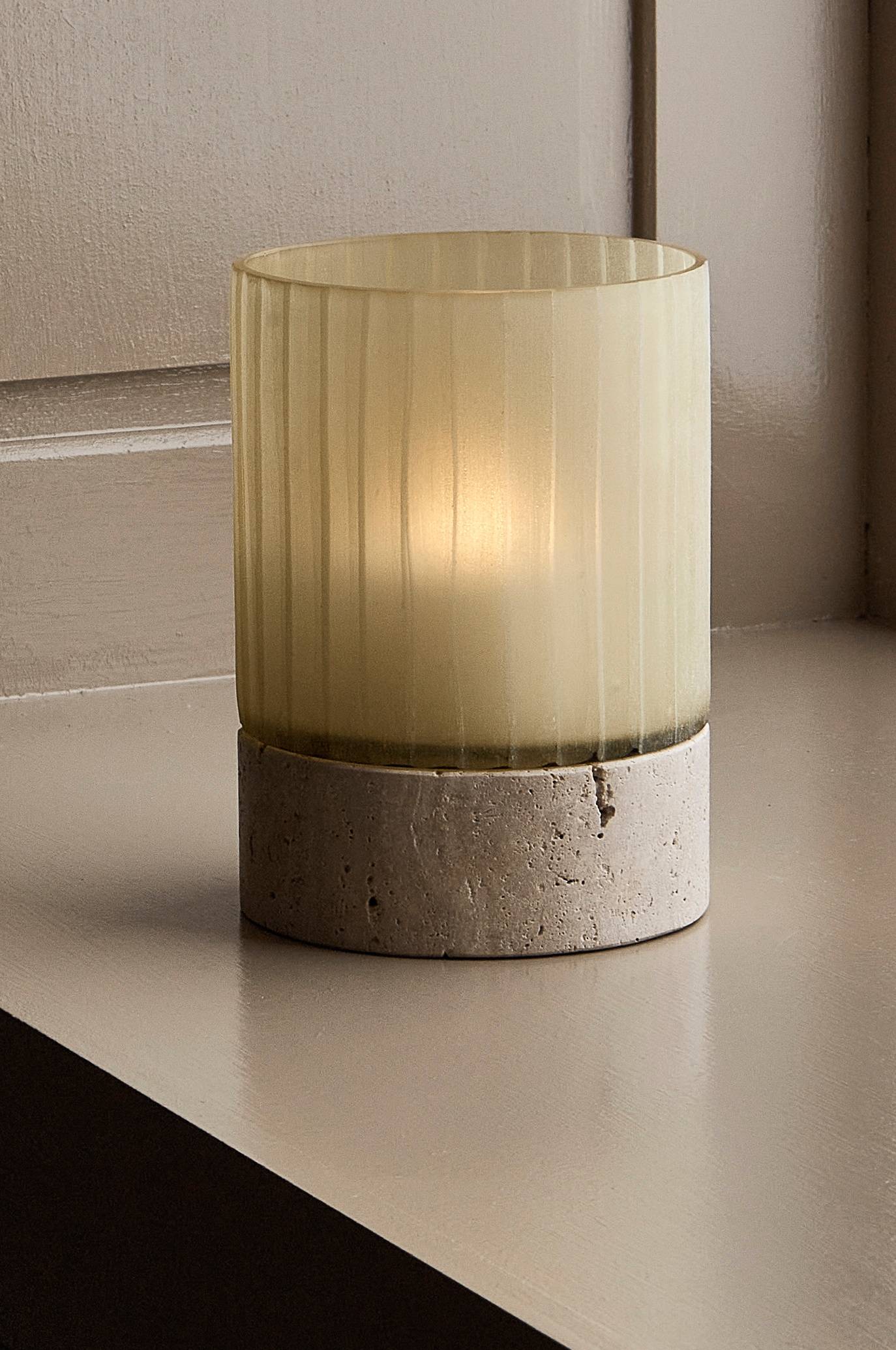 Lysestage i 2 dele. Lysestagen er af glas med matteret finish og står i en holder af travertin.