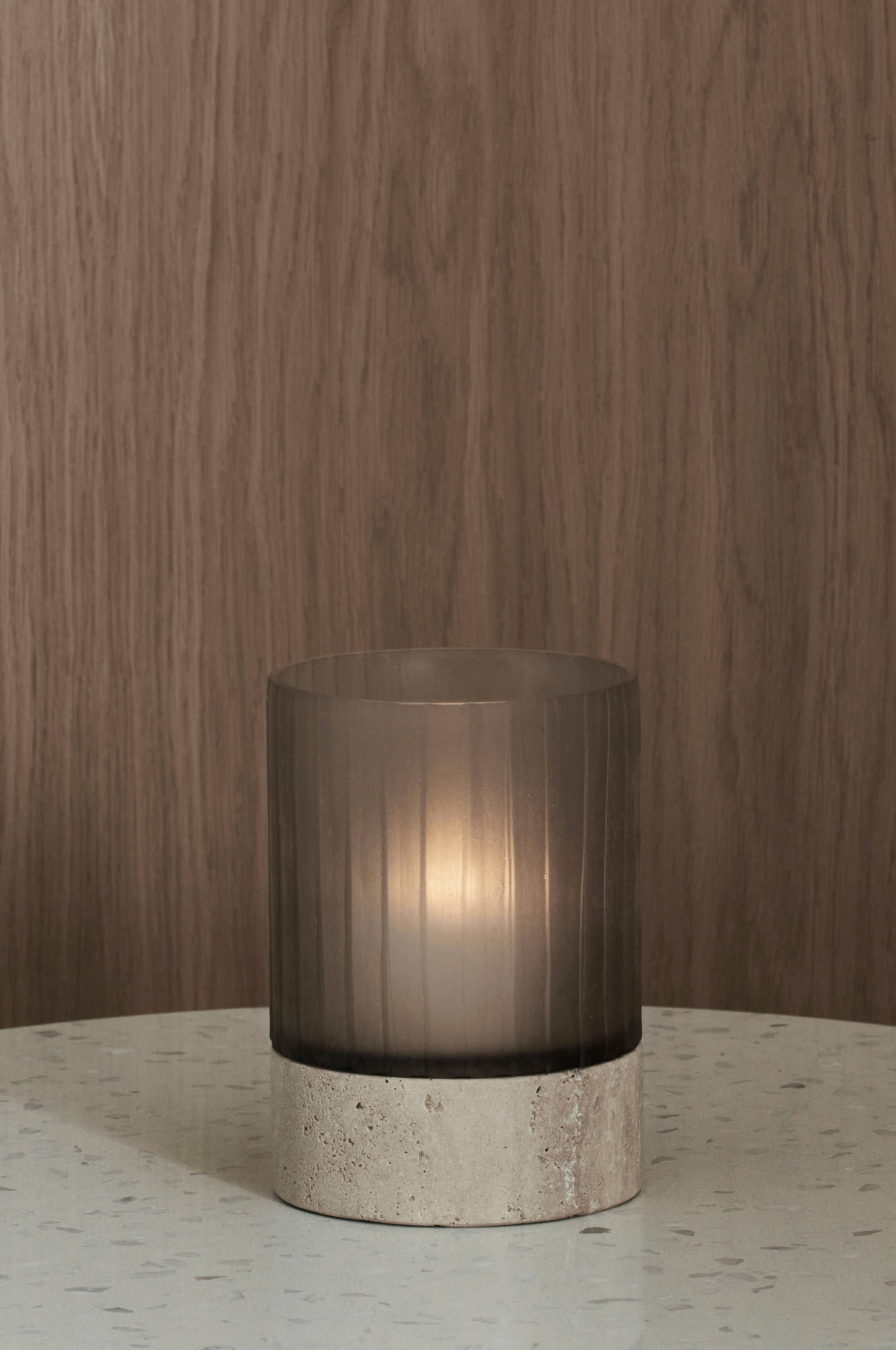 Lysestage i 2 dele. Lysestagen er af glas med matteret finish og står i en holder af travertin.