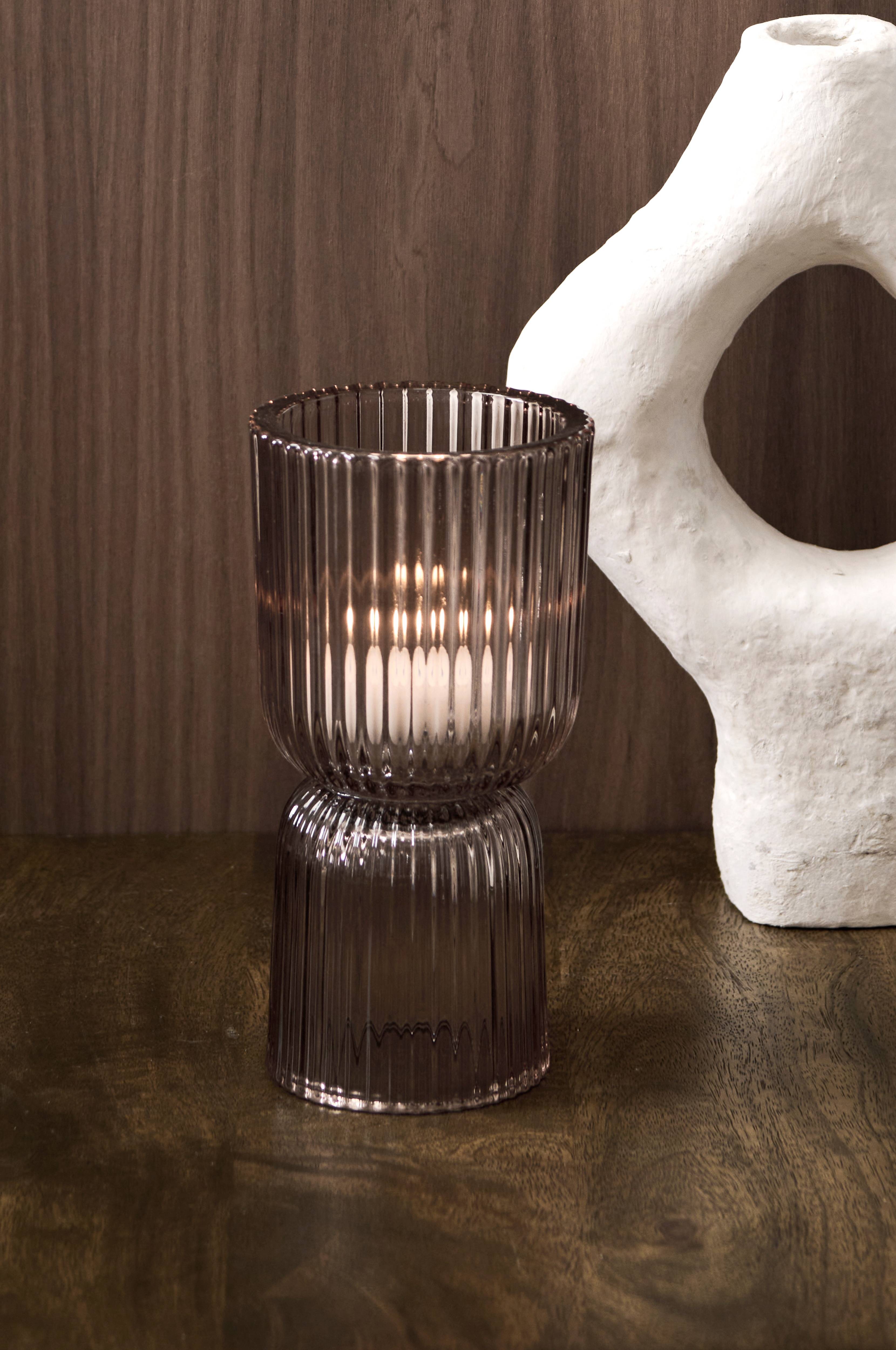 Lysestage i glas med rillet strukturmønster. Diameter foroven 9 cm, diameter forneden 7,5 cm.