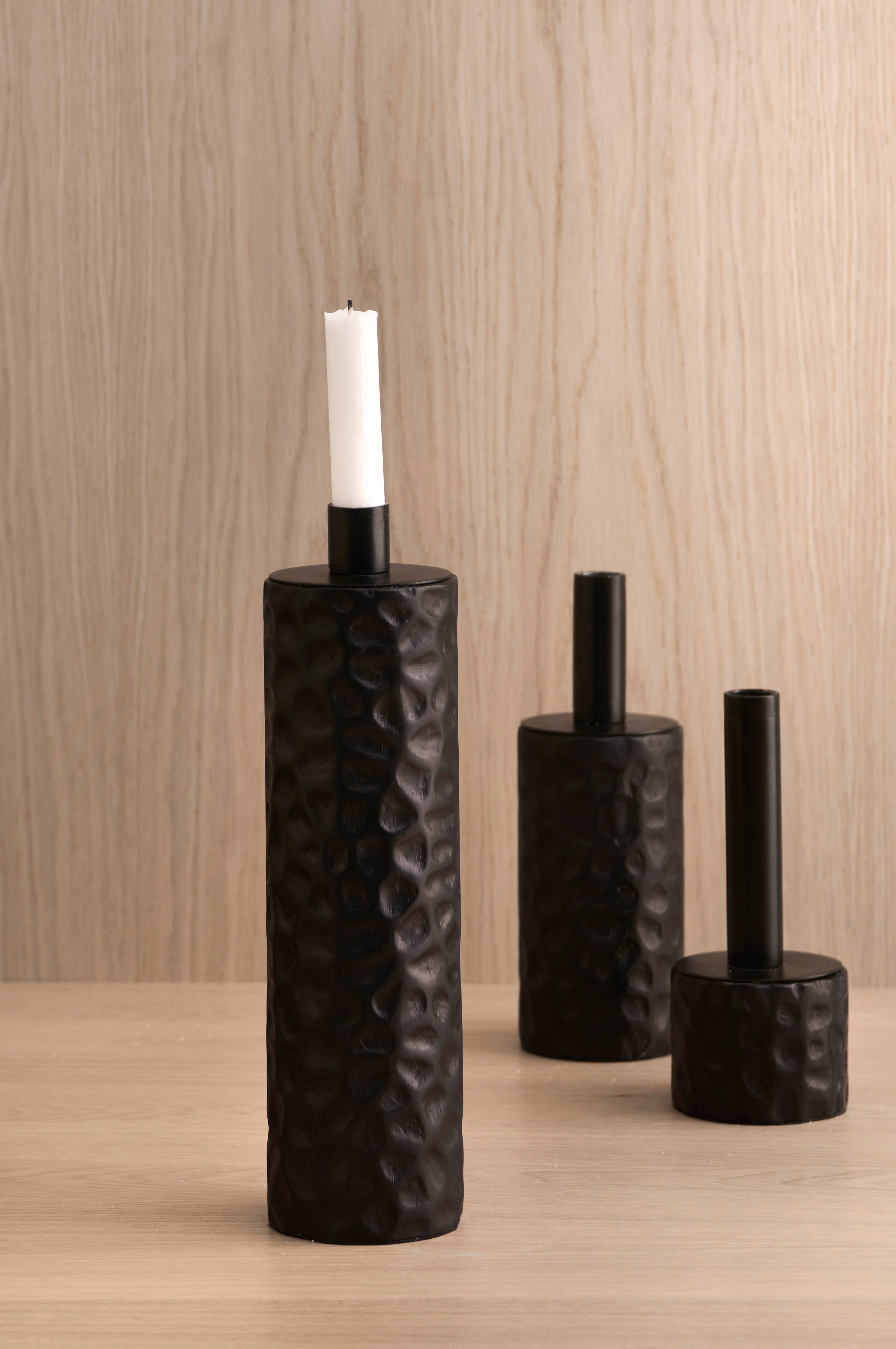 Håndlavet lysestage med udskåret strukturmønster på siden. Af mangotræ og metal. Højde 28,5 cm. Diameter 7,5 cm.