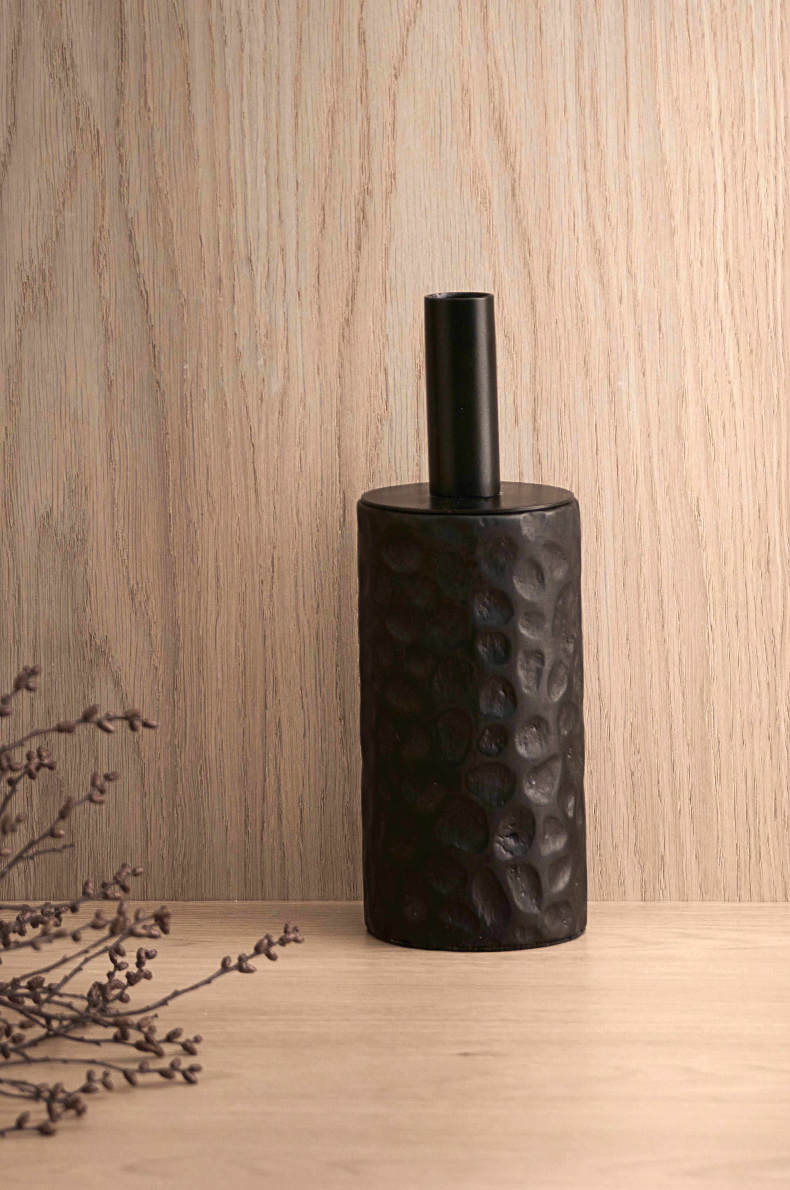 Håndlavet lysestage med udskåret strukturmønster på siden. Af mangotræ og metal. Højde 22,5 cm. Diameter 7,5 cm.