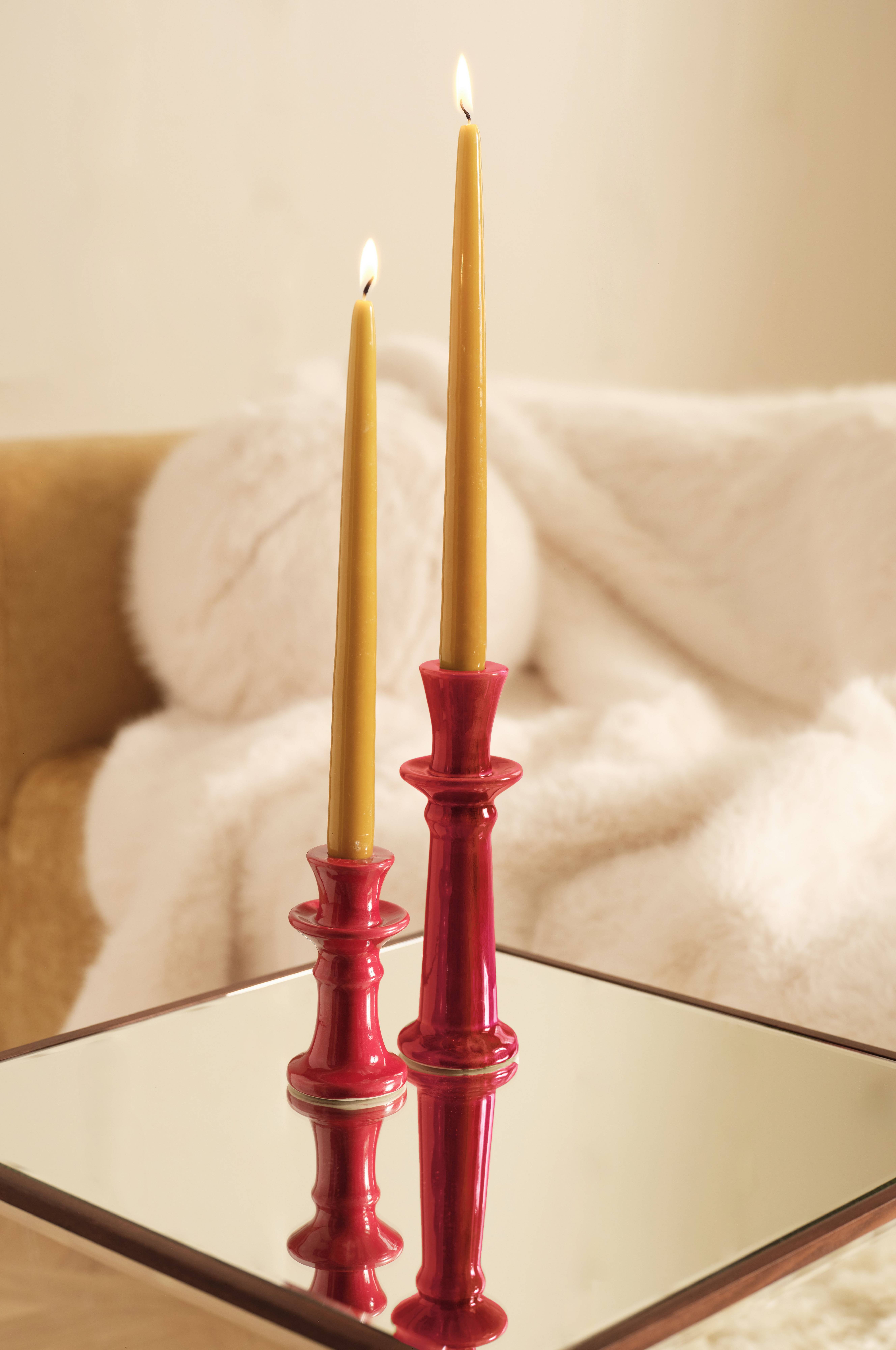 • To lysestager i glaseret keramik• Mål lysestage 1: Højde 21 cm. Diameter 6,5 cm.Mål lysestage 2: Højde 12,5 cm. Diameter 6,5 cm.• Diameter åbning (indvendig diameter): 2,3 cm.