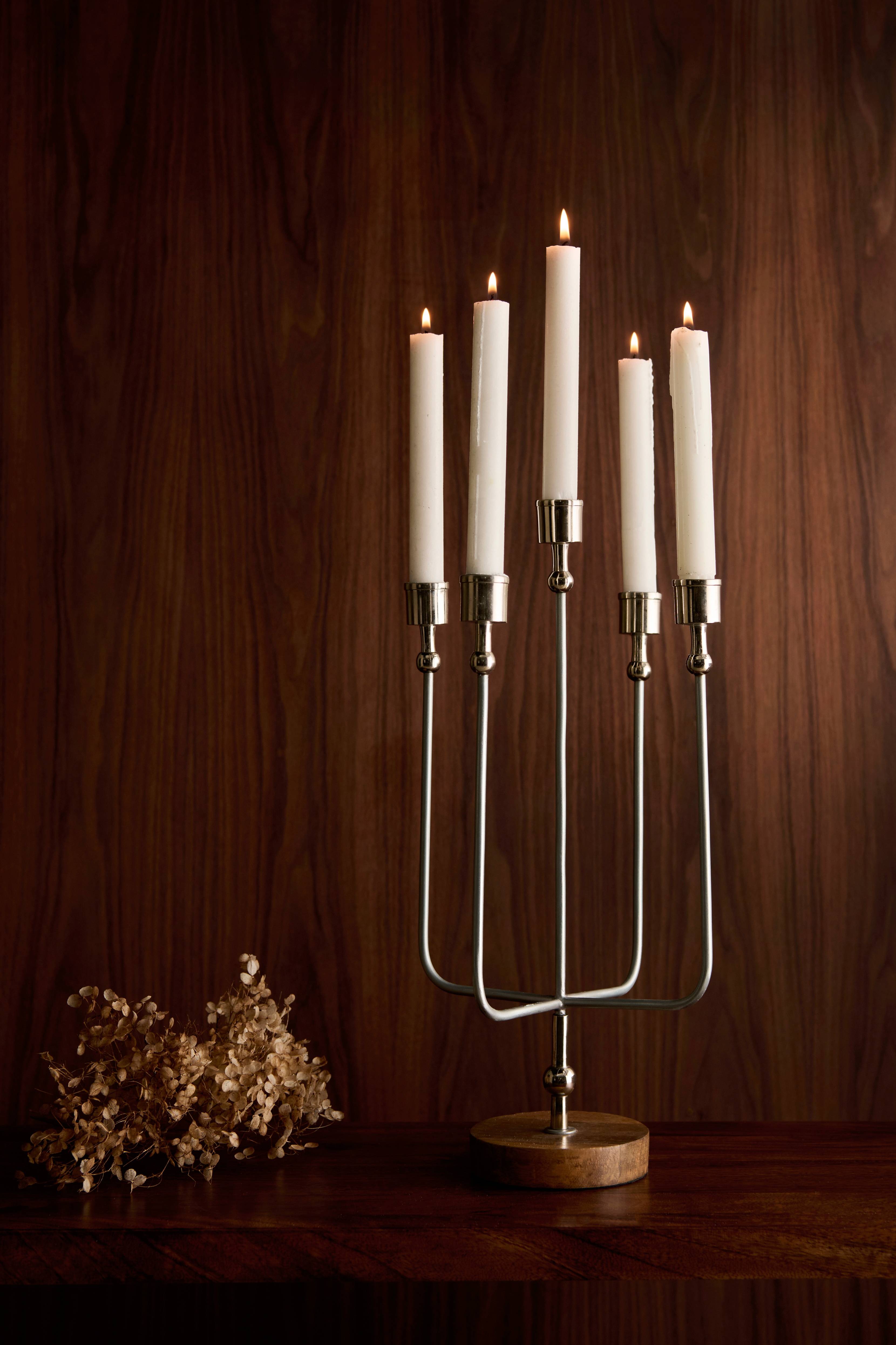 Lysestagen er sikker, når den forbliver lodret. Fem stearinlys sætter sig smukt i det. Velegnet til almindelige kronelys eller led stearinlys.