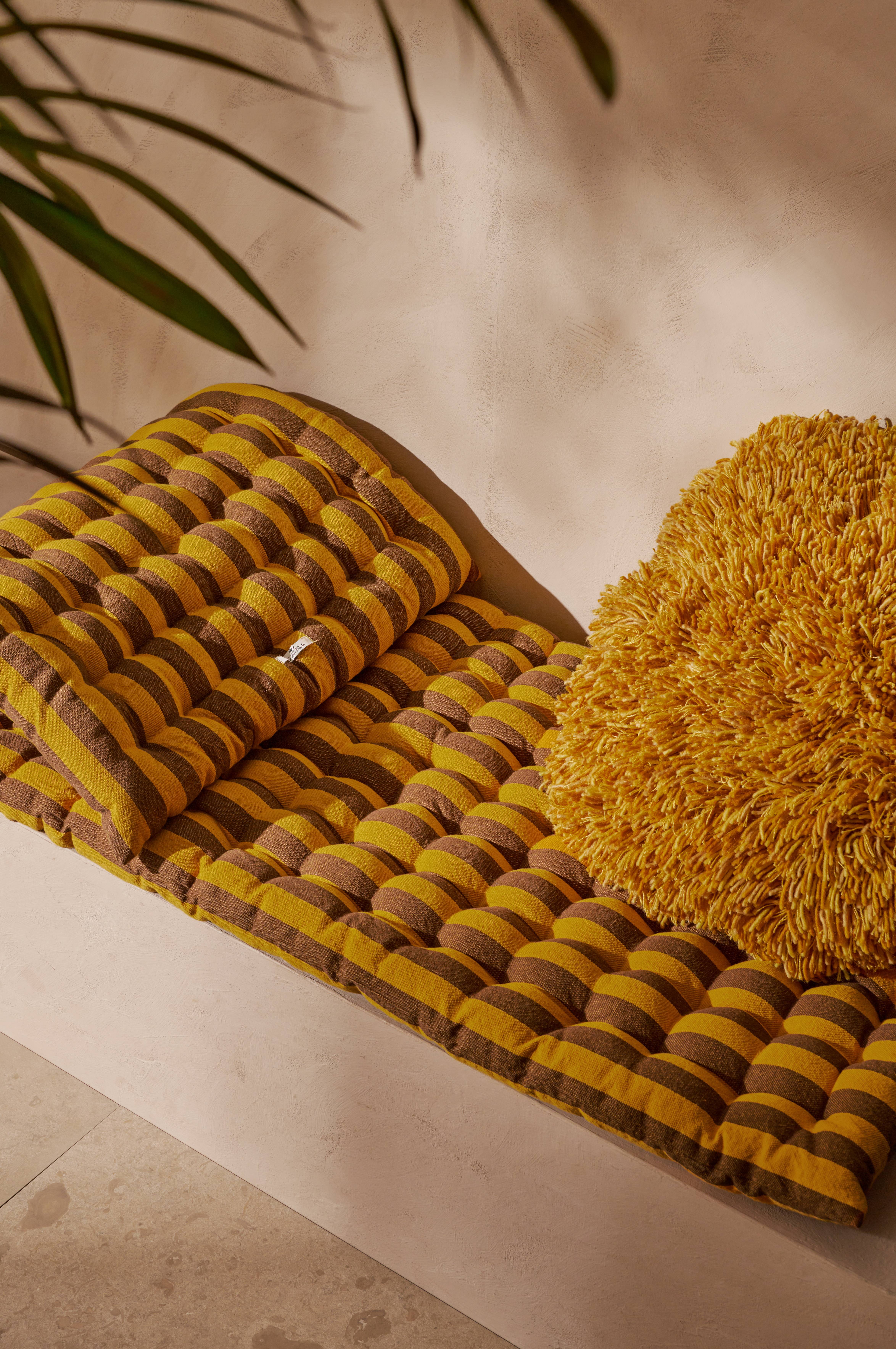 Madras med yderstof af vasket bomuld med grov struktur. Garnfarvede striber. Fyld af 100% polyester. Tykkelse 5 cm.
