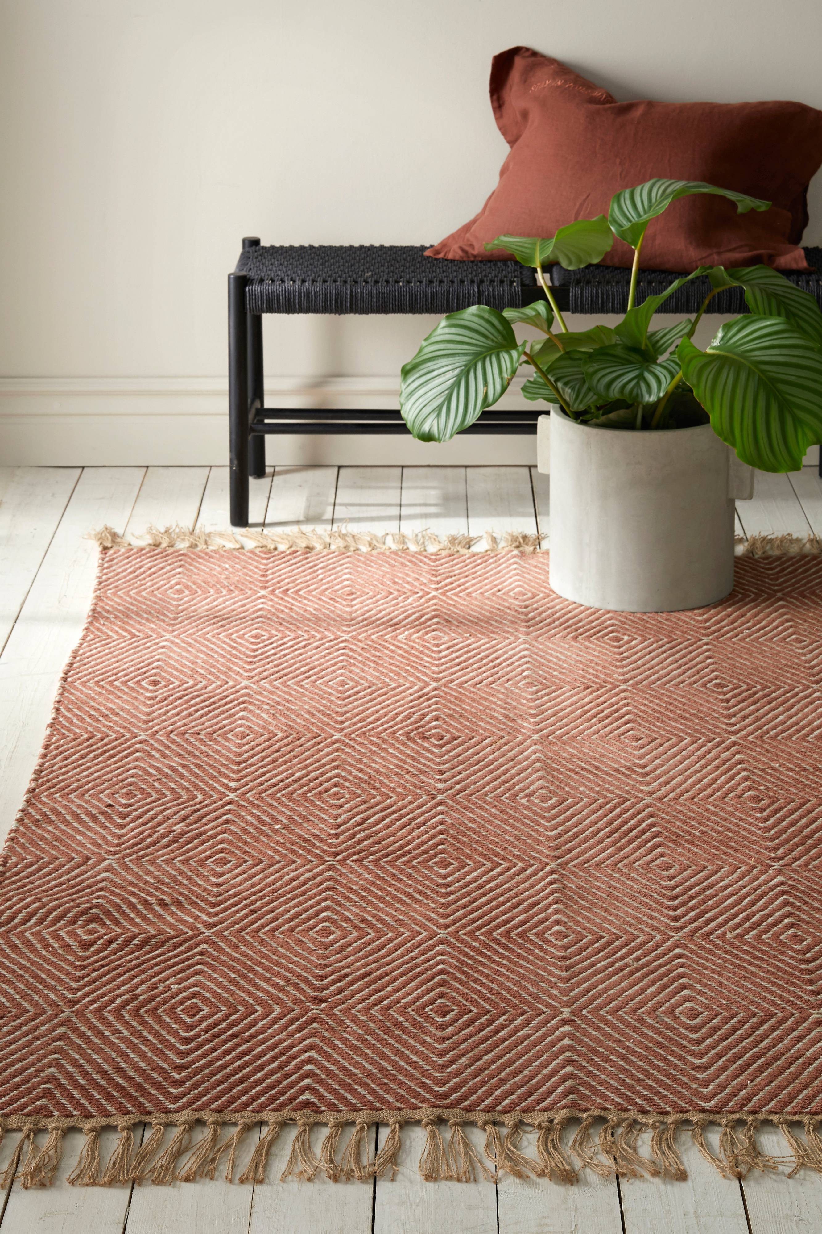 Gulvtæppe med dekorativt mønster i jute og bomuldschenille. Frynser og trend i jute.