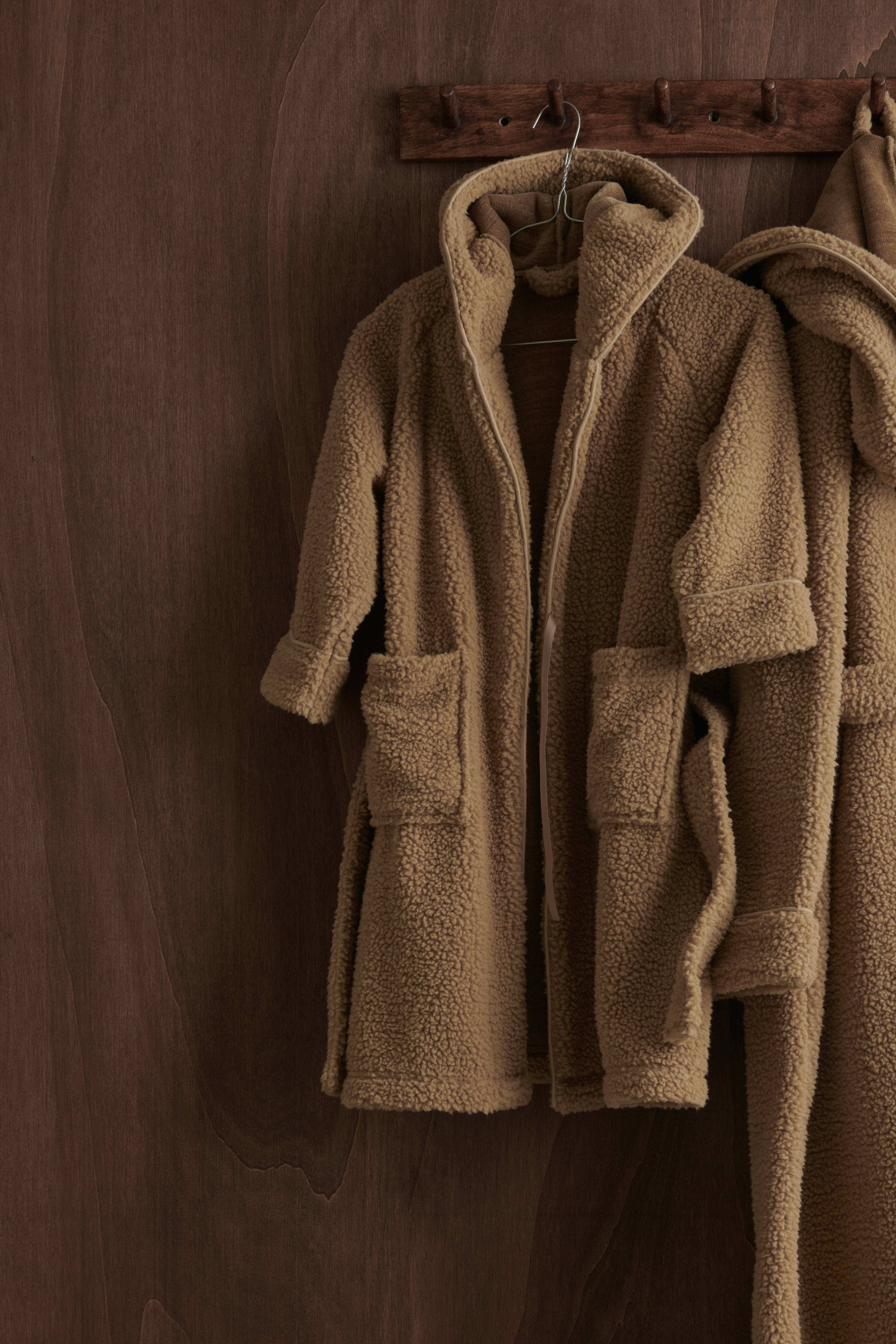 Morgenkåbe i blød plys med glat inderside. Hætte og to lommer. Bindebånd foran og aftageligt bindebælte i taljen.