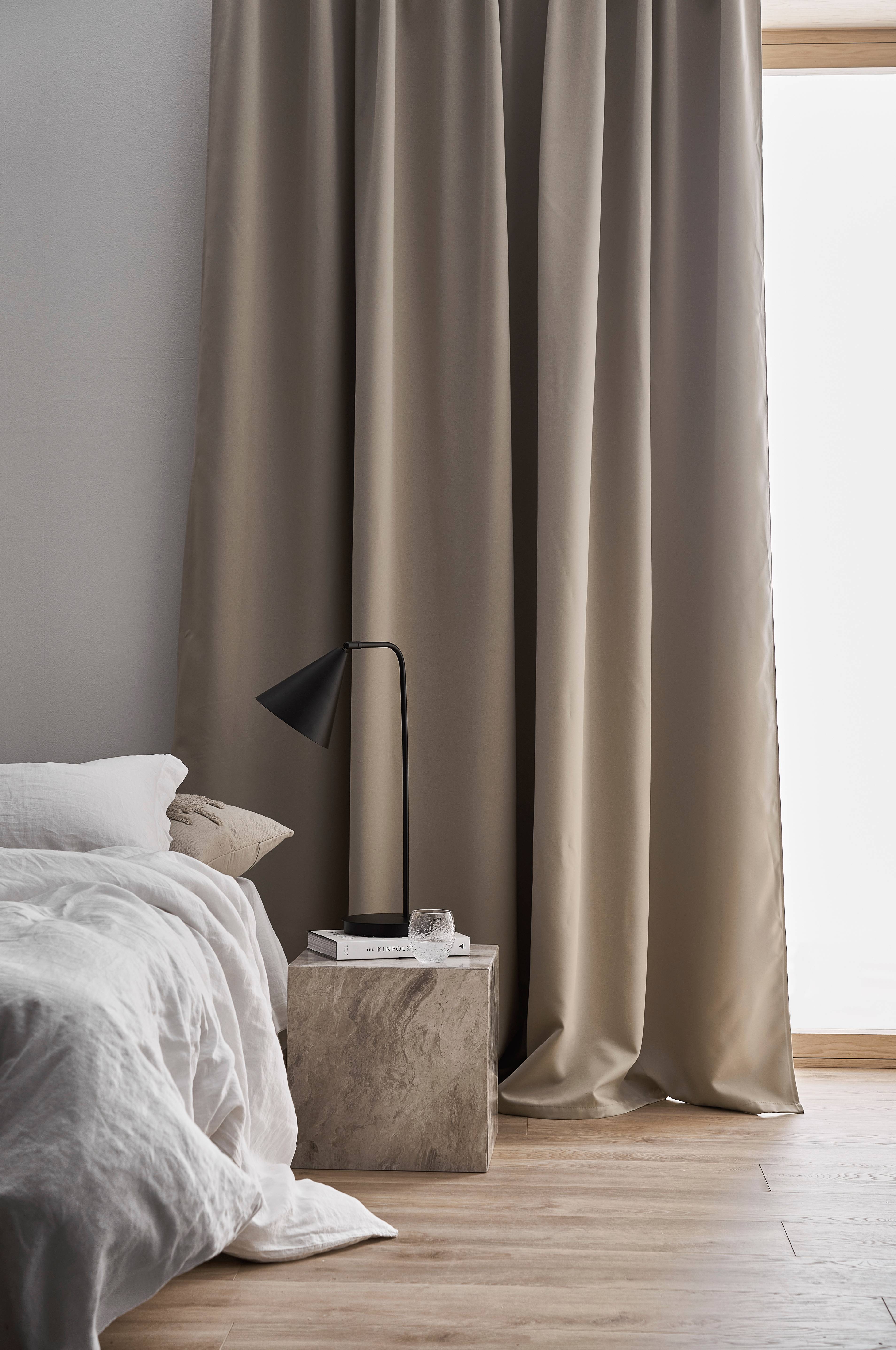 Mørklæggende gardin i kraftig kvalitet. Et vævet mellemlag med indvævede sorte tråde gør, at gardinet lukker 90% af lyset ude. Gardinet har multibånd, hvilket gør, at du enten kan hænge gardinerne direkte på en gardinstang gennem de skjulte stropper eller anvende ringe, nålekroge eller fingerkroge. Snore i rynkebåndet gør at du let kan skabe ensartede, flotte læg. Mål: 280x300 cm. Sælges enkeltvis.