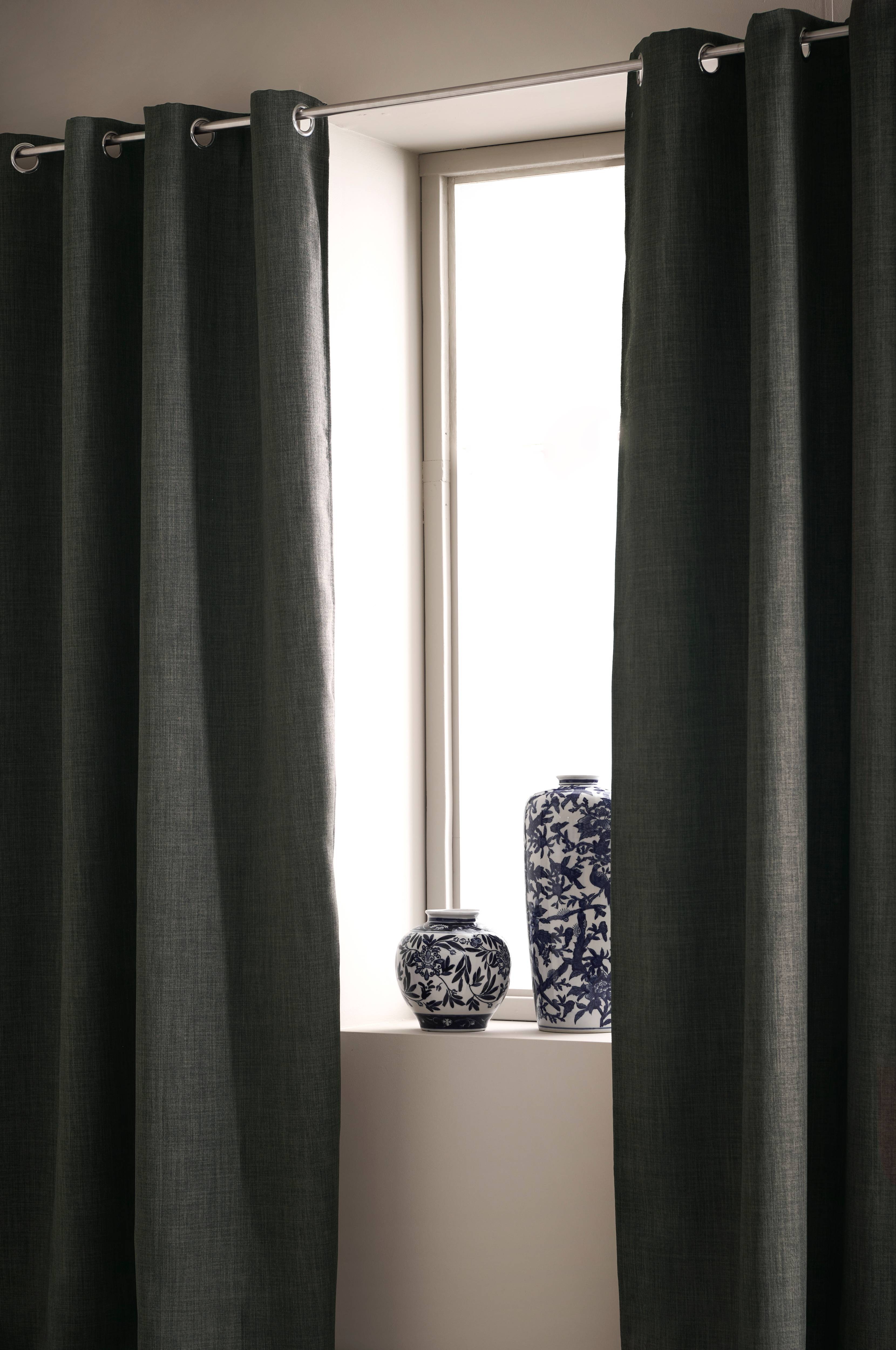 Mørklæggende gardin i hørlook med struktur og meleret effekt. Sejlringe i sølvfarvet metal. Et vævet mellemlag med indvævede sorte tråde gør, at gardinet lukker lyset ude. Matchende farve tone-i-tone på bagsiden. Bredde 140 cm. 2 længder: 220 og 250 cm. Stryges fugtige ved middelvarme på bagsiden.