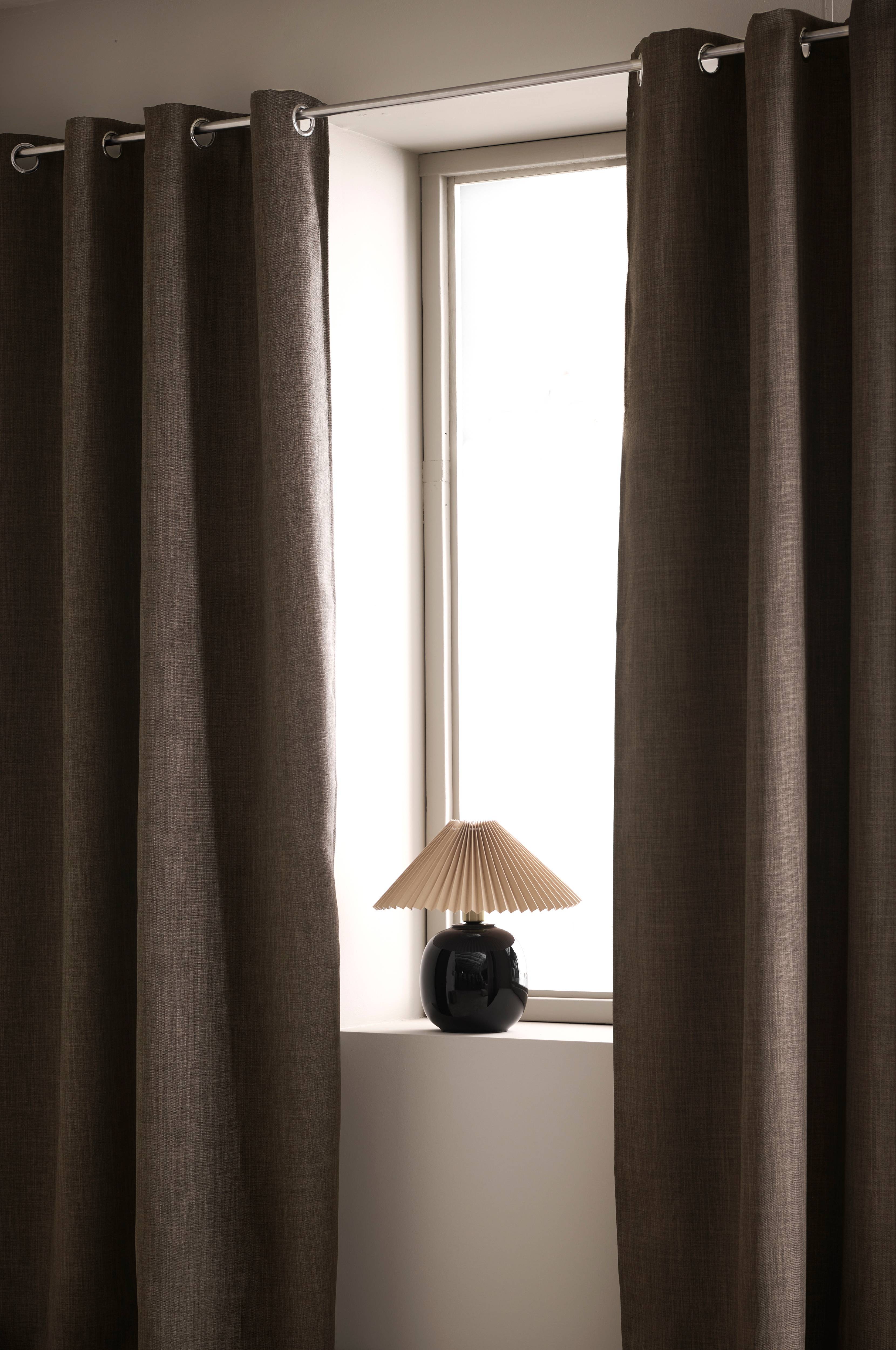 Mørklæggende gardin i hørlook med struktur og meleret effekt. Sejlringe i sølvfarvet metal. Et vævet mellemlag med indvævede sorte tråde gør, at gardinet lukker lyset ude. Matchende farve tone-i-tone på bagsiden. Bredde 140 cm. 2 længder: 220 og 250 cm. Stryges fugtige ved middelvarme på bagsiden.