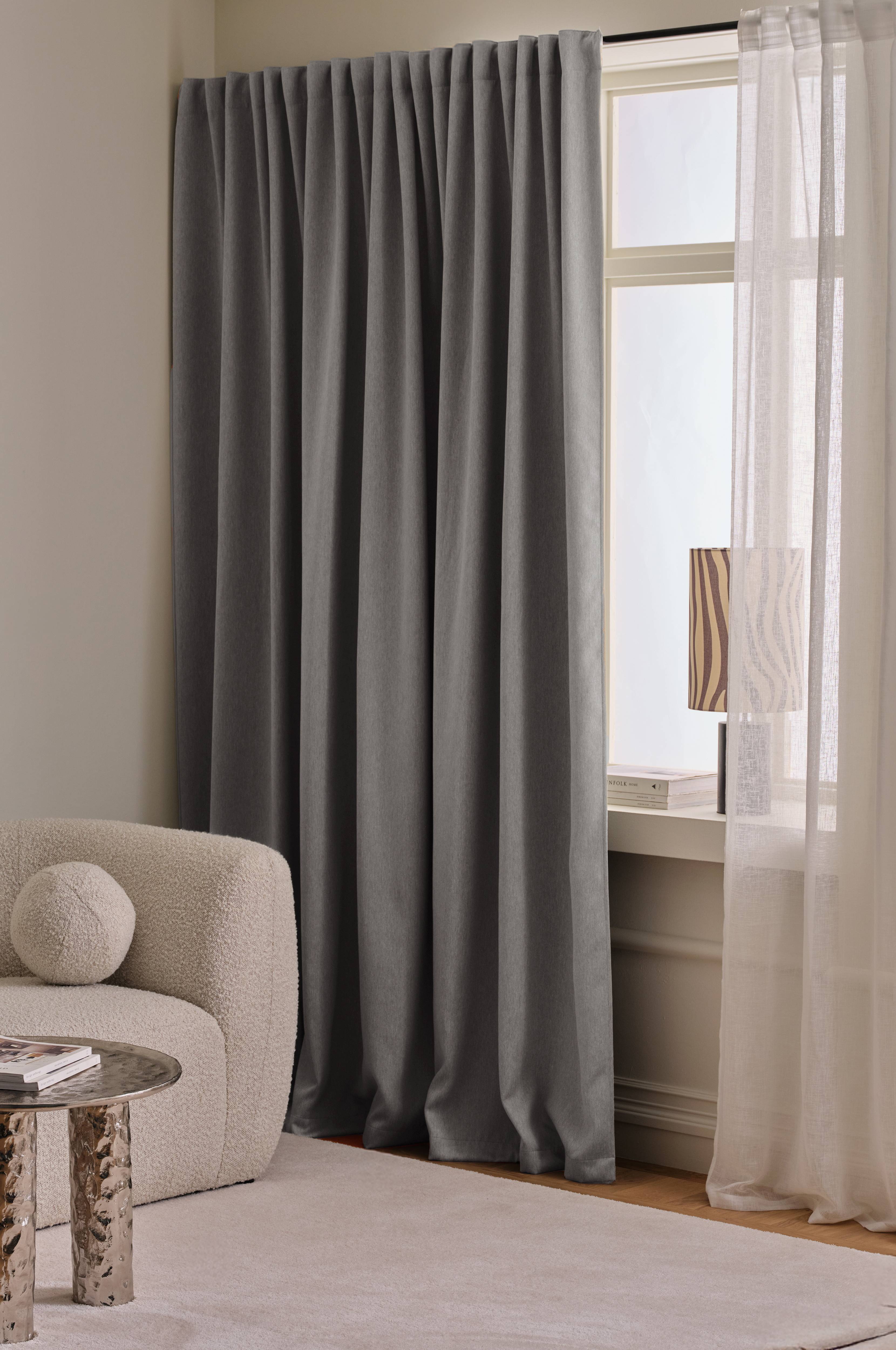 • Multibåndet gør, at du enten kan hænge gardinerne direkte på en gardinstang gennem de skjulte stropper eller anvende ringe, nålekroge eller fingerkroge. Snoren i rynkebåndet gør, at du let kan skabe ensartede, flotte læg.