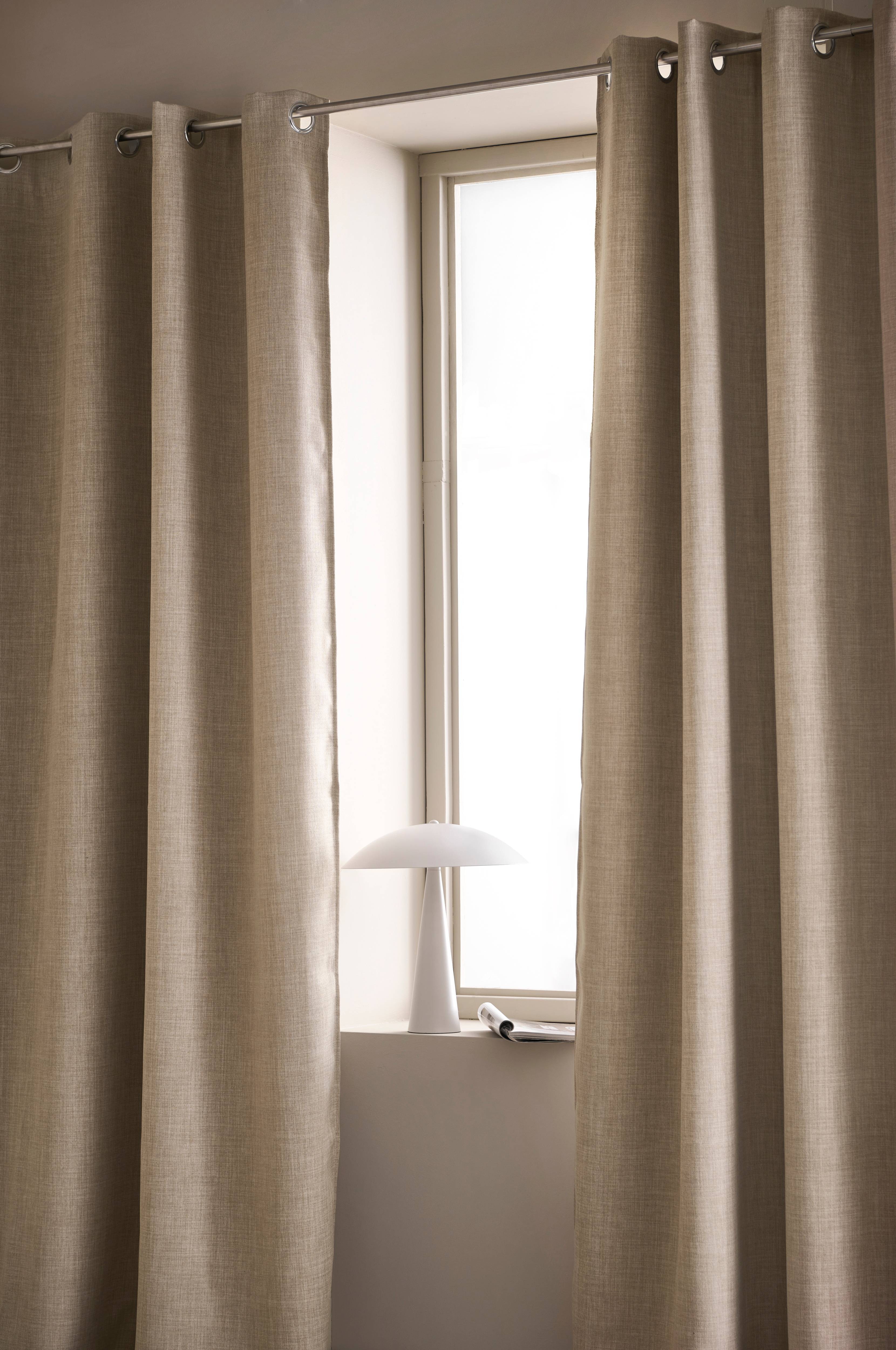Mørklæggende gardin i hørlook med struktur og meleret effekt. Sejlringe i sølvfarvet metal. Et vævet mellemlag med indvævede sorte tråde gør, at gardinet lukker lyset ude. Matchende farve tone-i-tone på bagsiden. Bredde 140 cm. 2 længder: 220 og 250 cm. Stryges fugtige ved middelvarme på bagsiden.