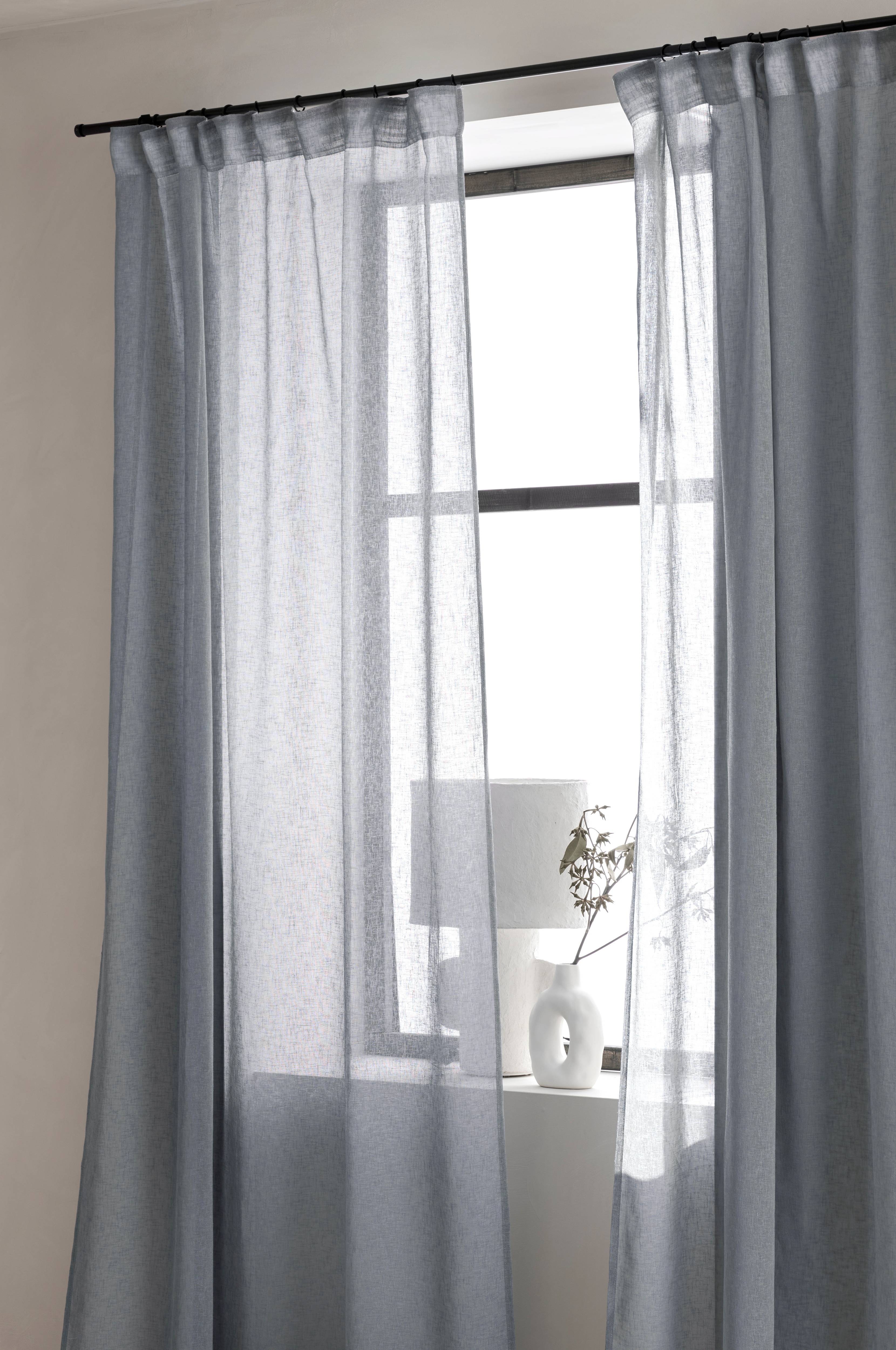 To multibåndsgardiner i løst vævet, genindvundet polyester med let struktur. Multibåndet gør, at du enten kan hænge gardinerne direkte på en gardinstang gennem stropperne eller anvende rynkebåndskroge, nålekroge eller fingerkroge. Snoren i rynkebåndet gør, at du let kan skabe ensartede, flotte læg. Bredde 135 cm. Tre længder: 220, 250 og 300 cm.