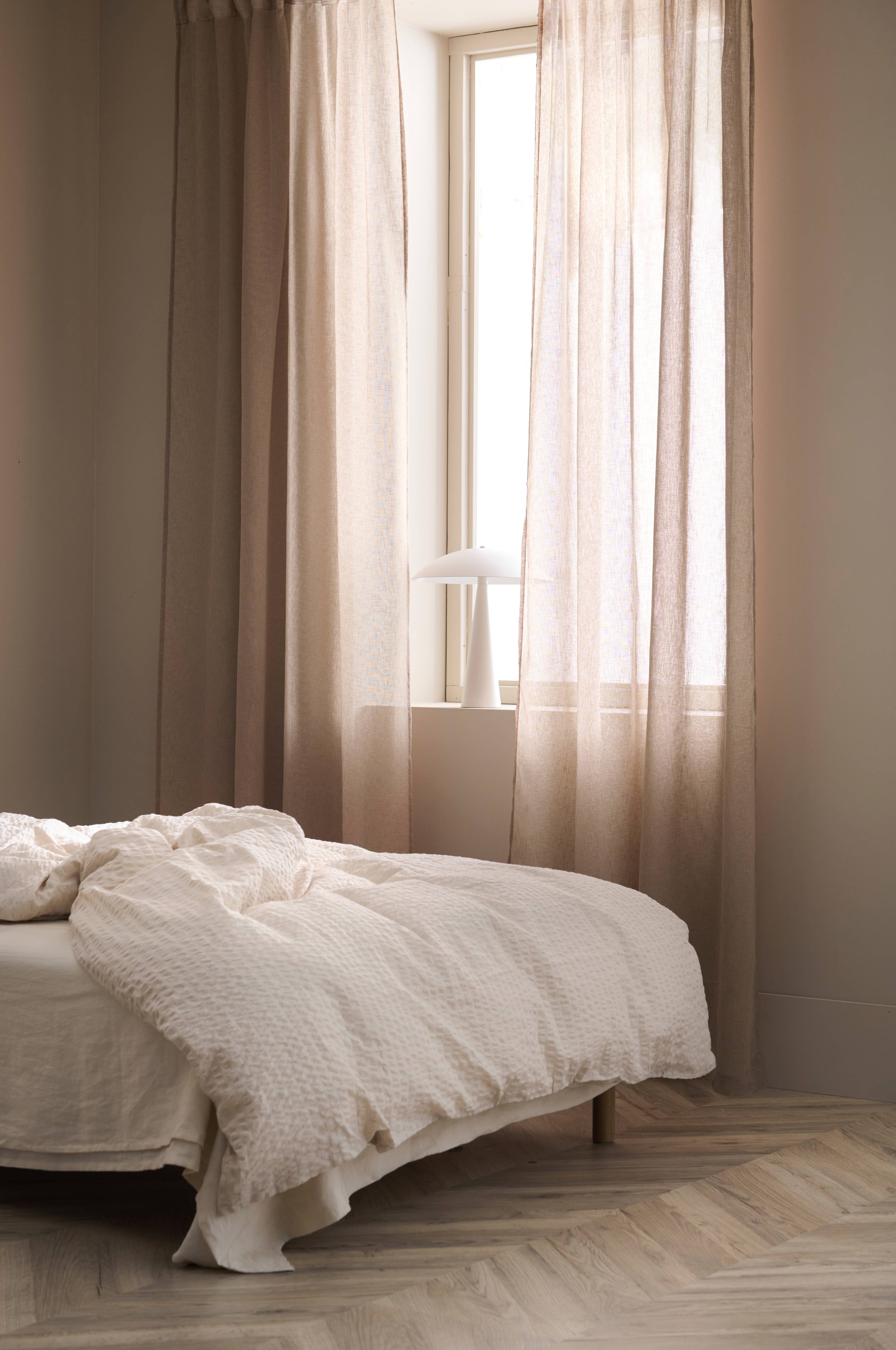 To multibåndsgardiner i løst vævet, genindvundet polyester med let struktur. Multibåndet gør, at du enten kan hænge gardinerne direkte på en gardinstang gennem stropperne eller anvende rynkebåndskroge, nålekroge eller fingerkroge. Snoren i rynkebåndet gør, at du let kan skabe ensartede, flotte læg. Bredde 135 cm. Tre længder: 220, 250 og 300 cm.