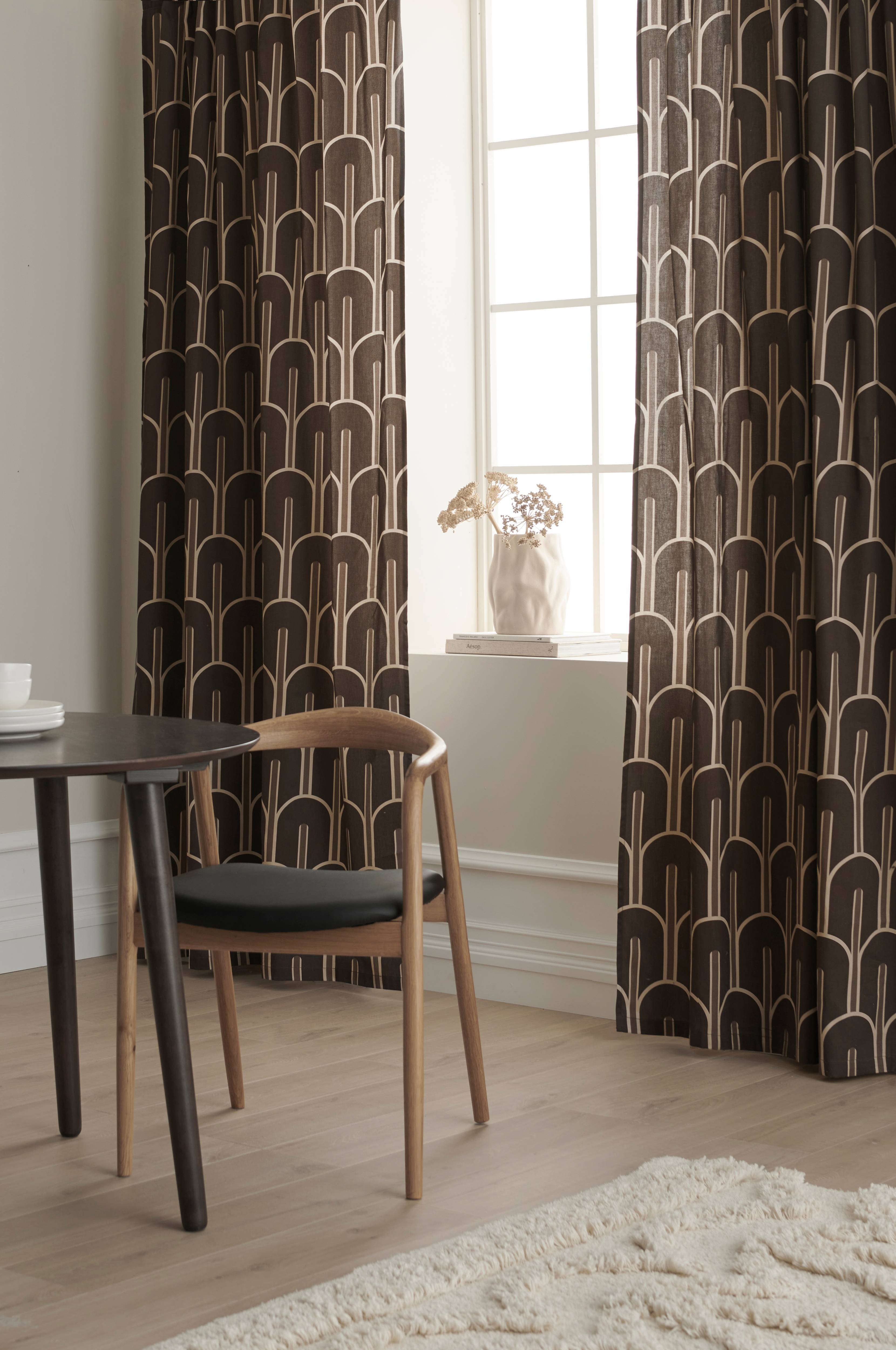 To multibåndsgardiner i bomuldssatin med printet mønster og mat finish. Multibåndet gør, at du enten kan hænge gardinerne direkte på en gardinstang gennem stropperne eller anvende ringe, nålekroge eller fingerkroge. Bredde 145 cm.