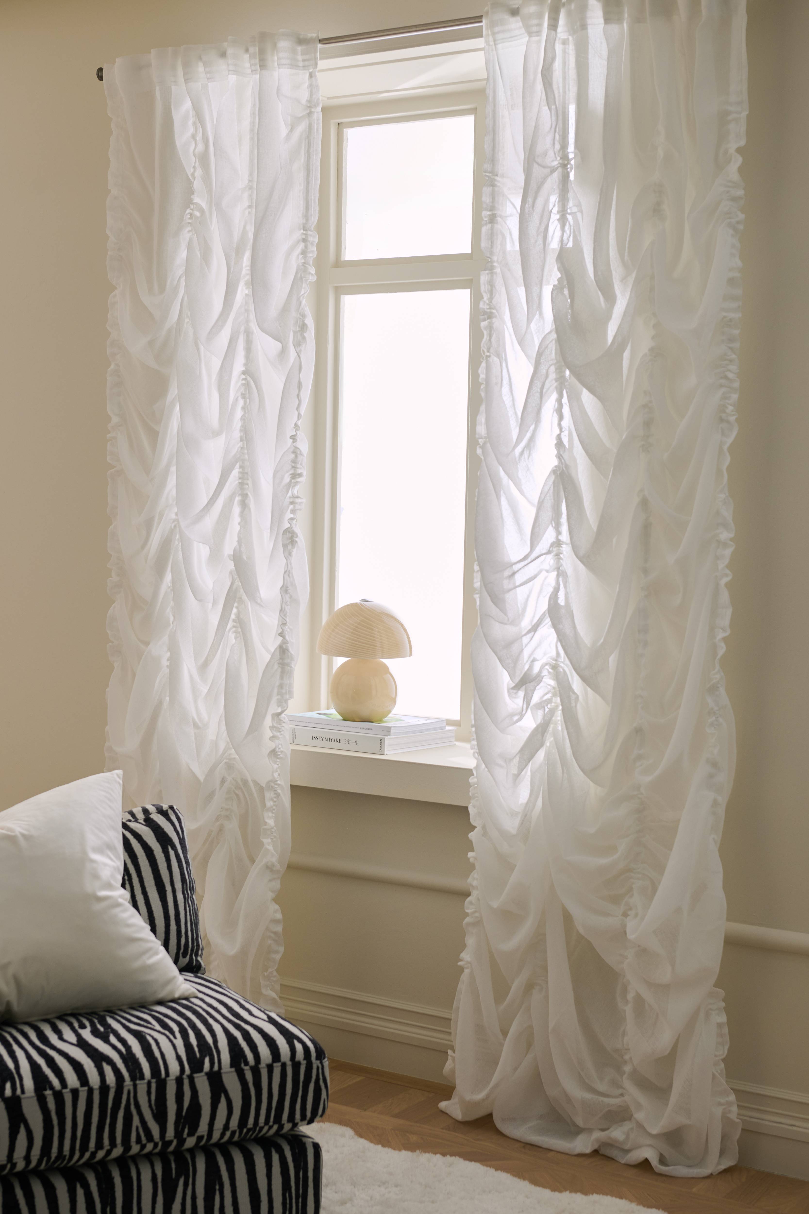 • Gardinet har indsyede lodrette snore, som gør det muligt at trække det op og skabe stilfulde, draperede effekter. Gardinet kan trækkes op til maksimalt ca. 60 cm. Snorene kan skjules i folden i bunden.