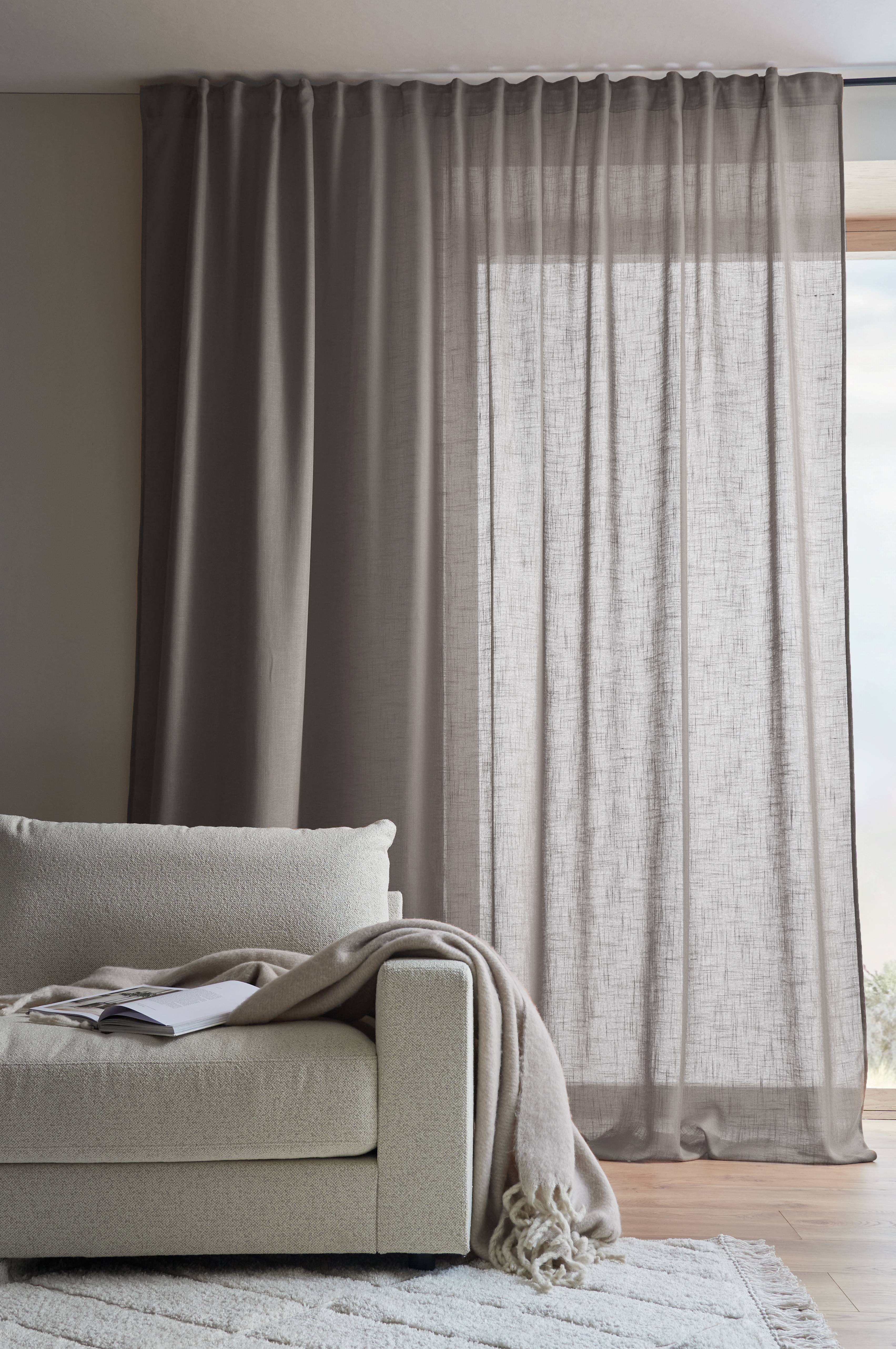 Ekstra bredt multibåndsgardin i lidt grovere hørlook i blød, genindvundet polyester. Multibåndet gør, at du enten kan hænge gardinet direkte på en gardinstang gennem de skjulte stropper eller anvende ringe, nålekroge eller fingerkroge. Snoren i rynkebåndet gør, at du let kan skabe ensartede, flotte læg. Sælges enkeltvis.