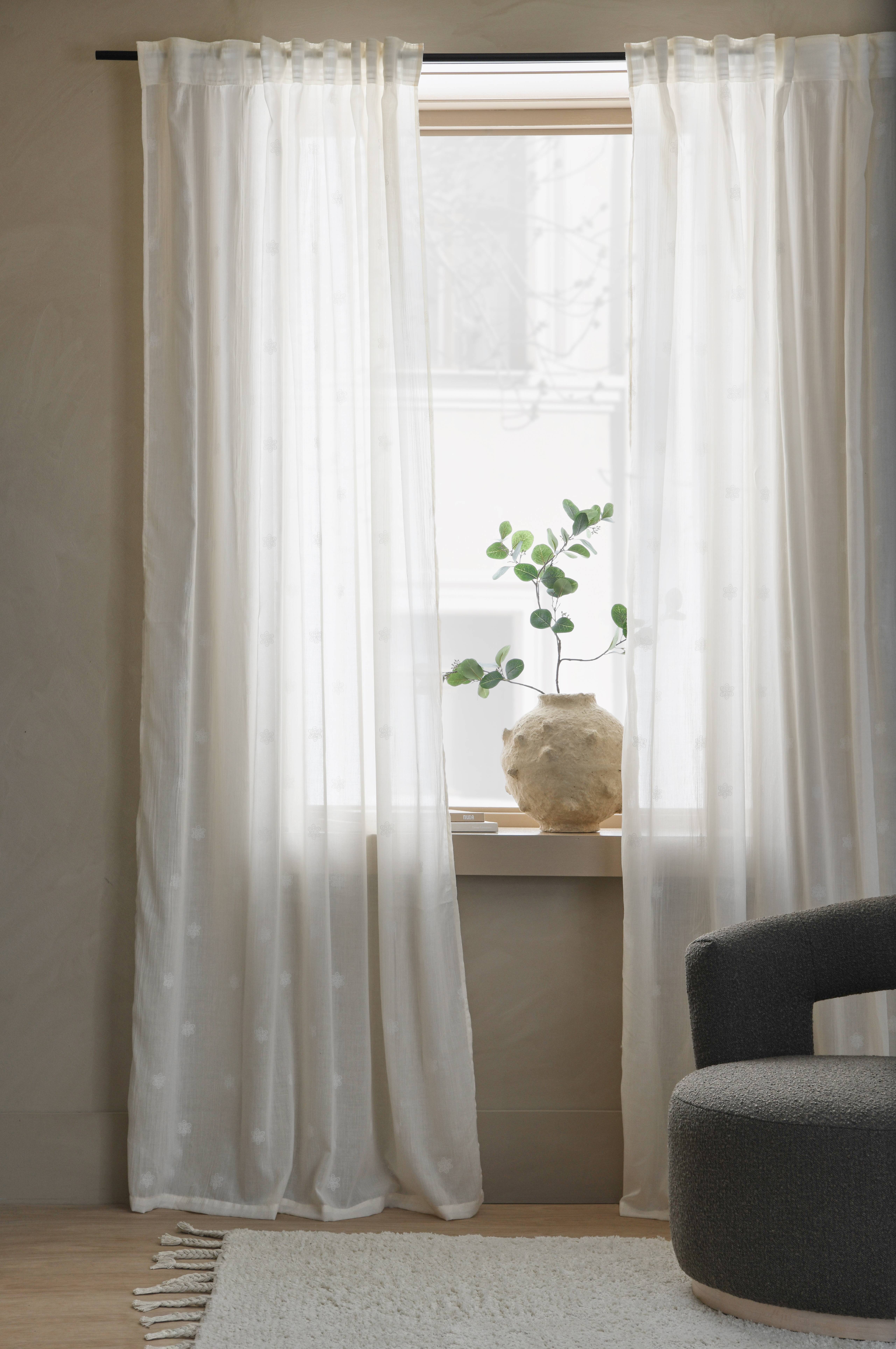To multibåndslængder i tynd, semitransparent voile. Printet, broderilignende blomstermønster med let struktur. Multibåndet gør, at du enten kan hænge gardinerne direkte på en gardinstang gennem de skjulte stropper eller anvende ringe, nålekroge eller fingerkroge. Snore i rynkebåndet gør at du let kan skabe ensartede, flotte læg. Bredde 125 cm.
