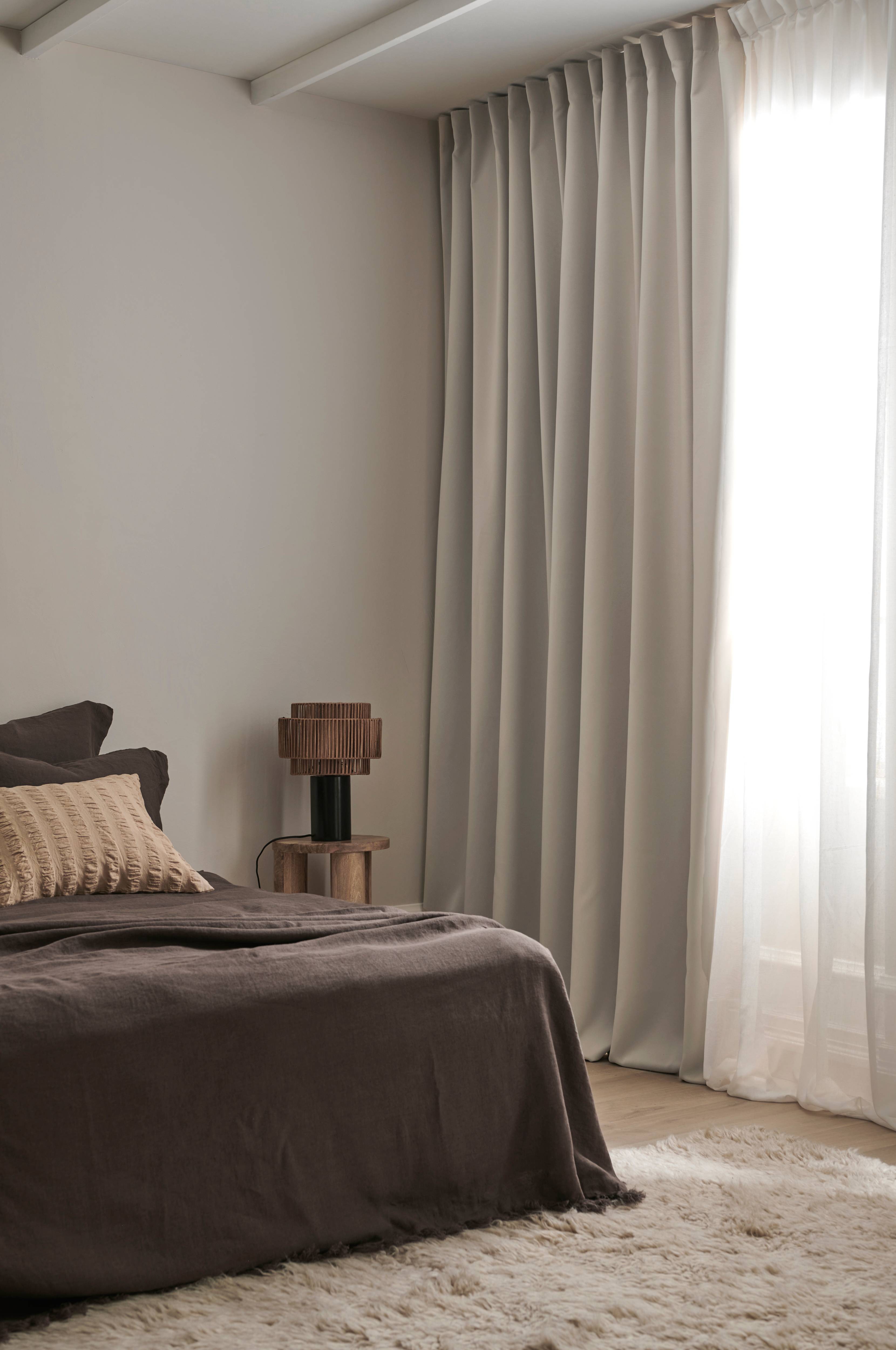 Ekstra bred gardinlængde med multibånd med indvævede sorte tråde som gør, at gardinet lukker lyset ude. Multibåndet gør, at du enten kan hænge gardinet direkte på en gardinstang gennem de skjulte stropper eller anvende ringe, nålekroge eller fingerkroge. Str. 290x300 cm. Sælges i 1-pak.