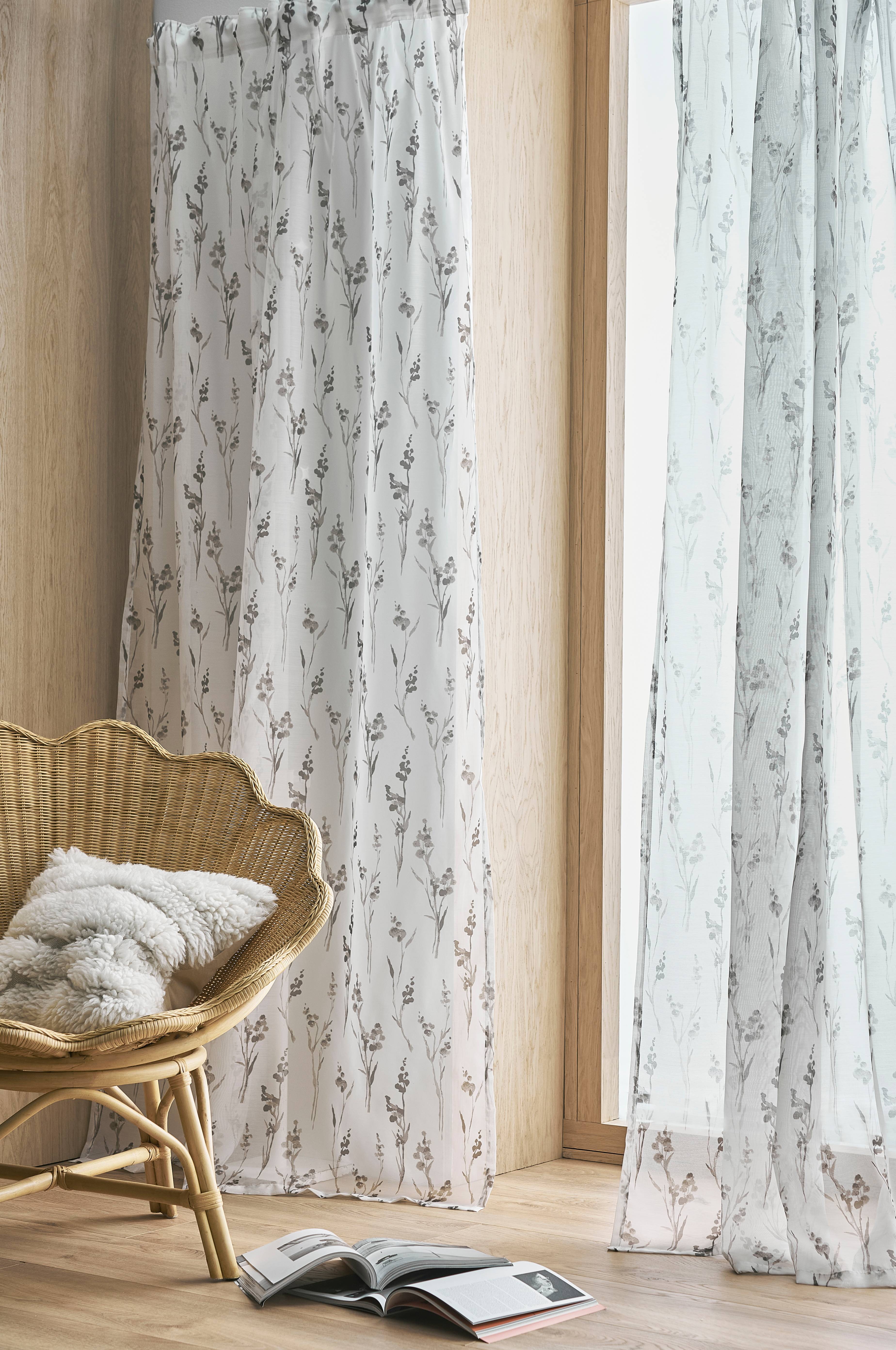 To multibåndslængder i luftig, transparent kvalitet med printet mønster. Multibåndet gør, at du enten kan hænge gardinerne direkte på en gardinstang gennem de skjulte stropper eller anvende ringe, nålekroge eller fingerkroge. Snore i rynkebåndet gør at du let kan skabe ensartede, flotte læg.