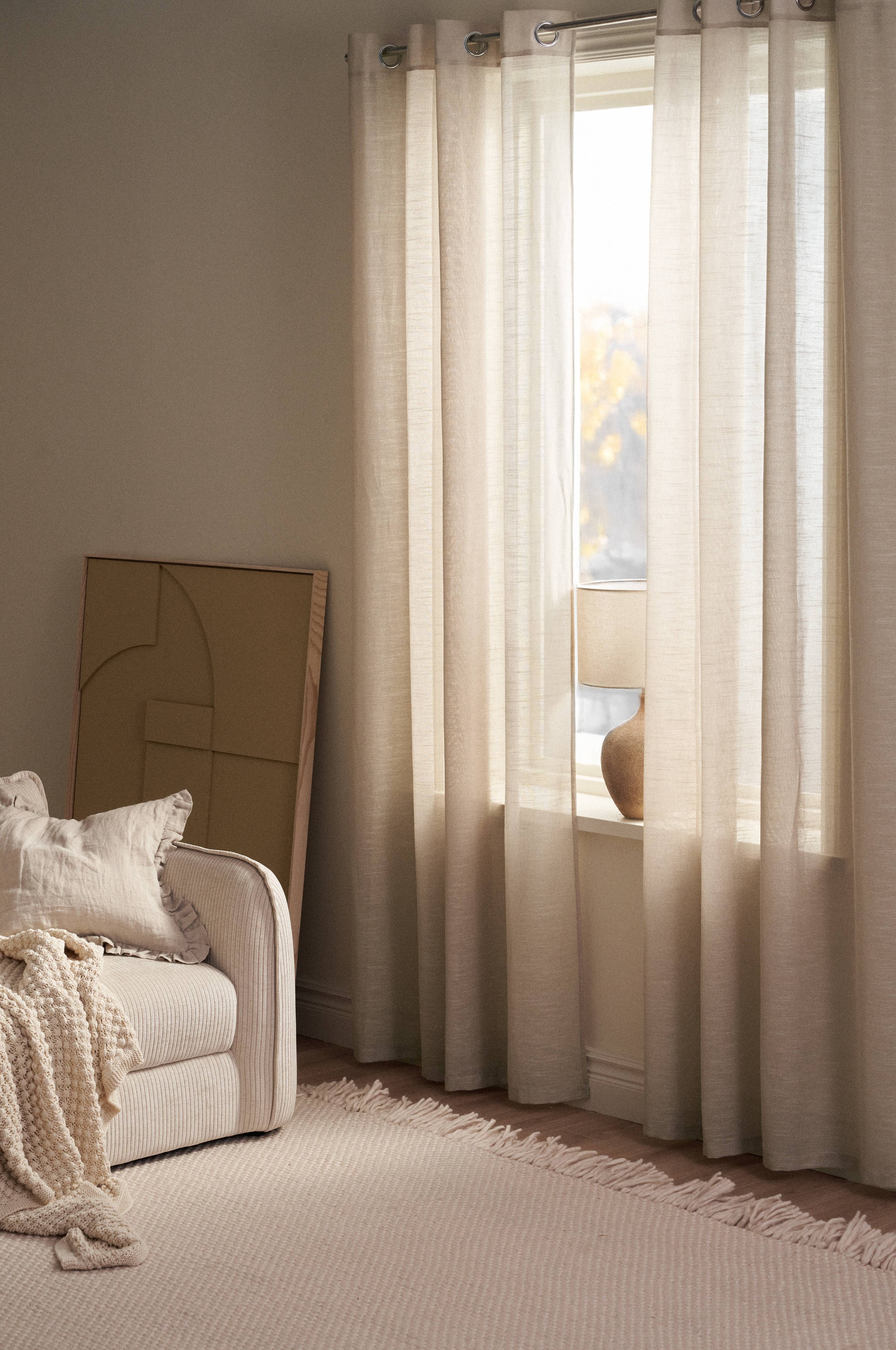 • To Øjenforhænger i gennemsigtig Voile med hørfølelse