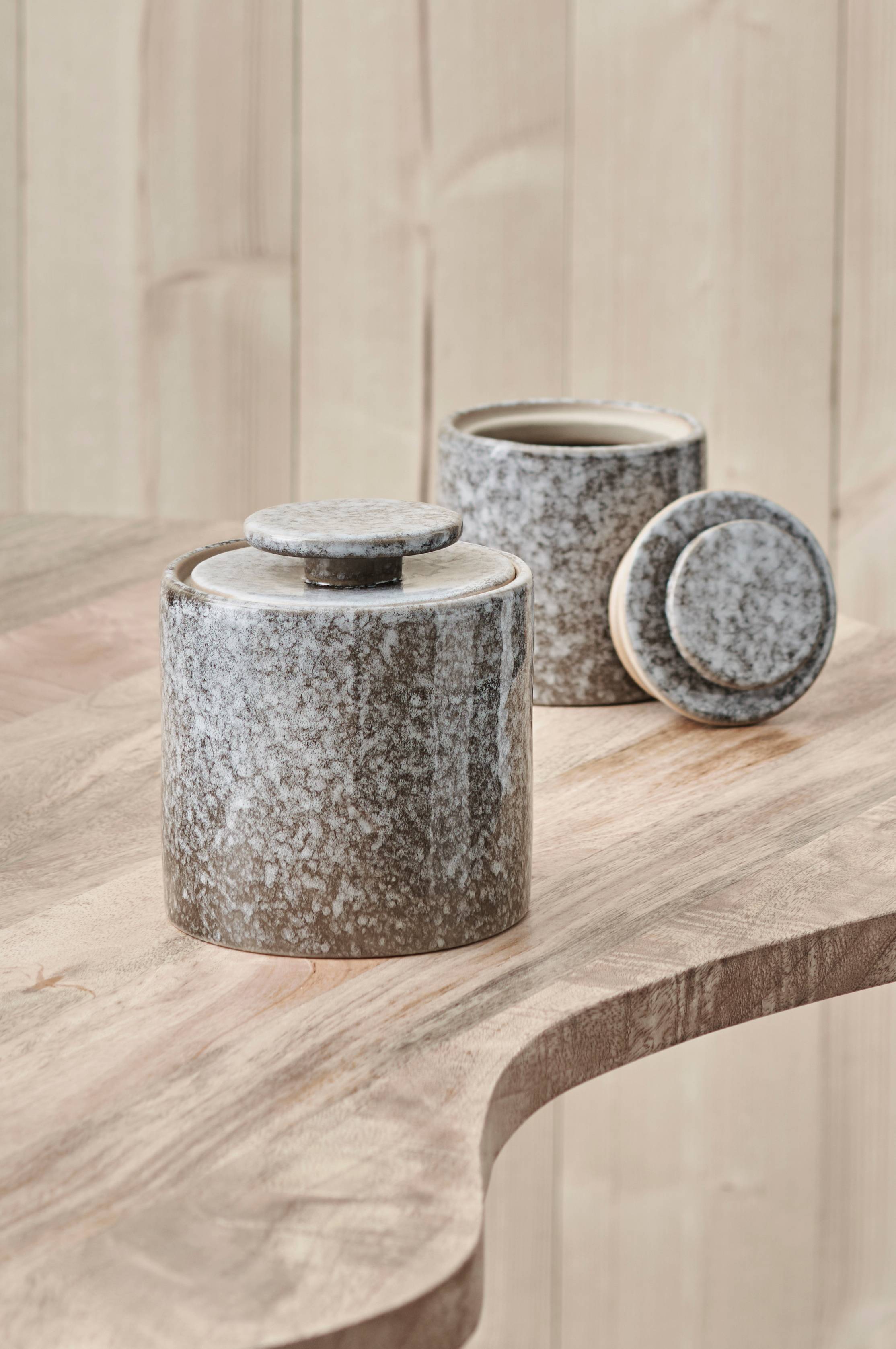 Opbevaringskrukke af glaseret keramik med låg. Højde inkl. låg 12,5 cm.