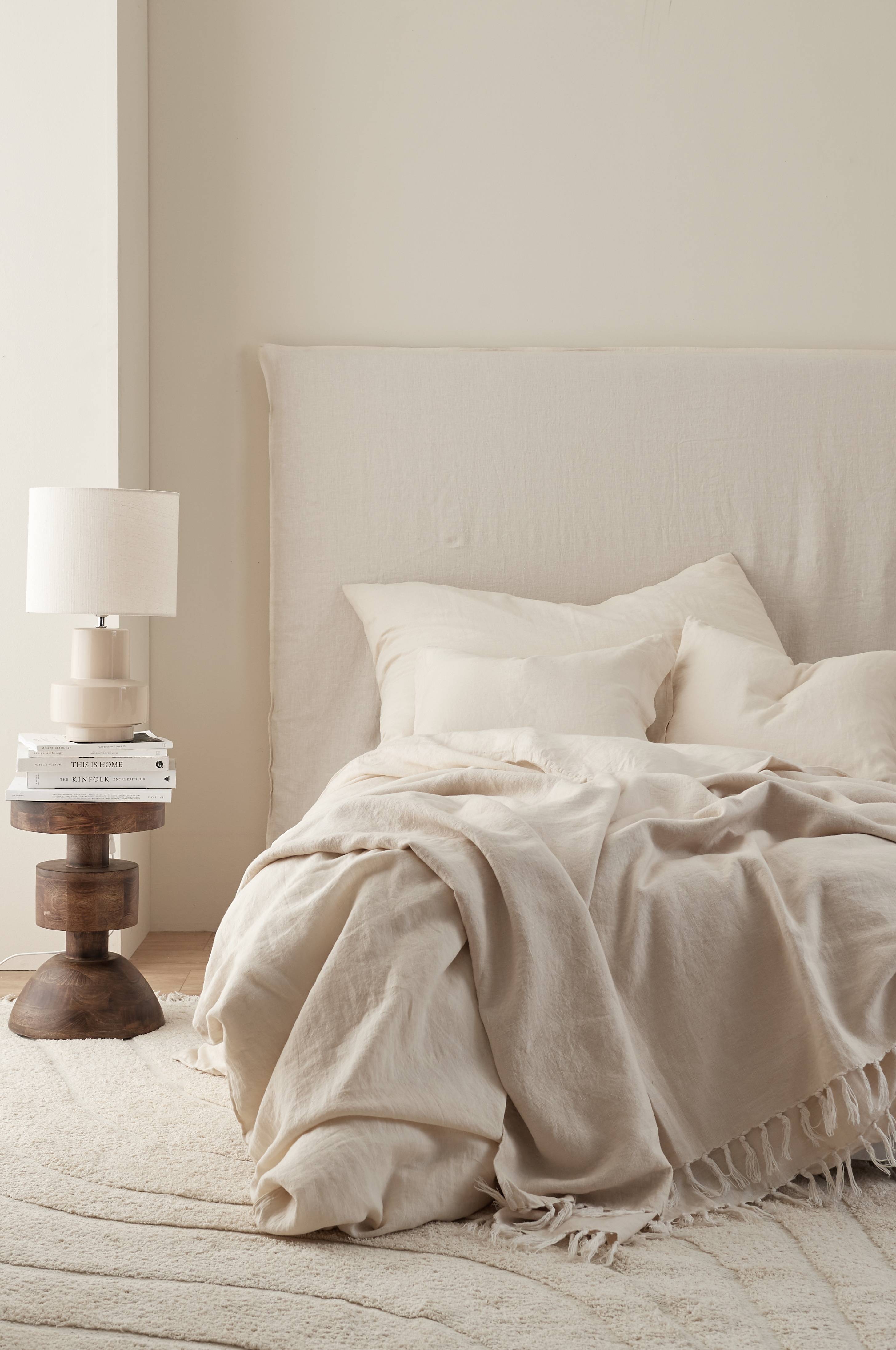 Et betræk i hør, som du trækker over din sengegavl. Betrækket har løs pasform, afhængigt af hvor dyb din sengegavl er, og sengen får et afslappet udtryk. Dobbelte denimsømme på 3 sider. Betrækket er i en blød og behagelig vasket hørkvalitet fra Frankrig.