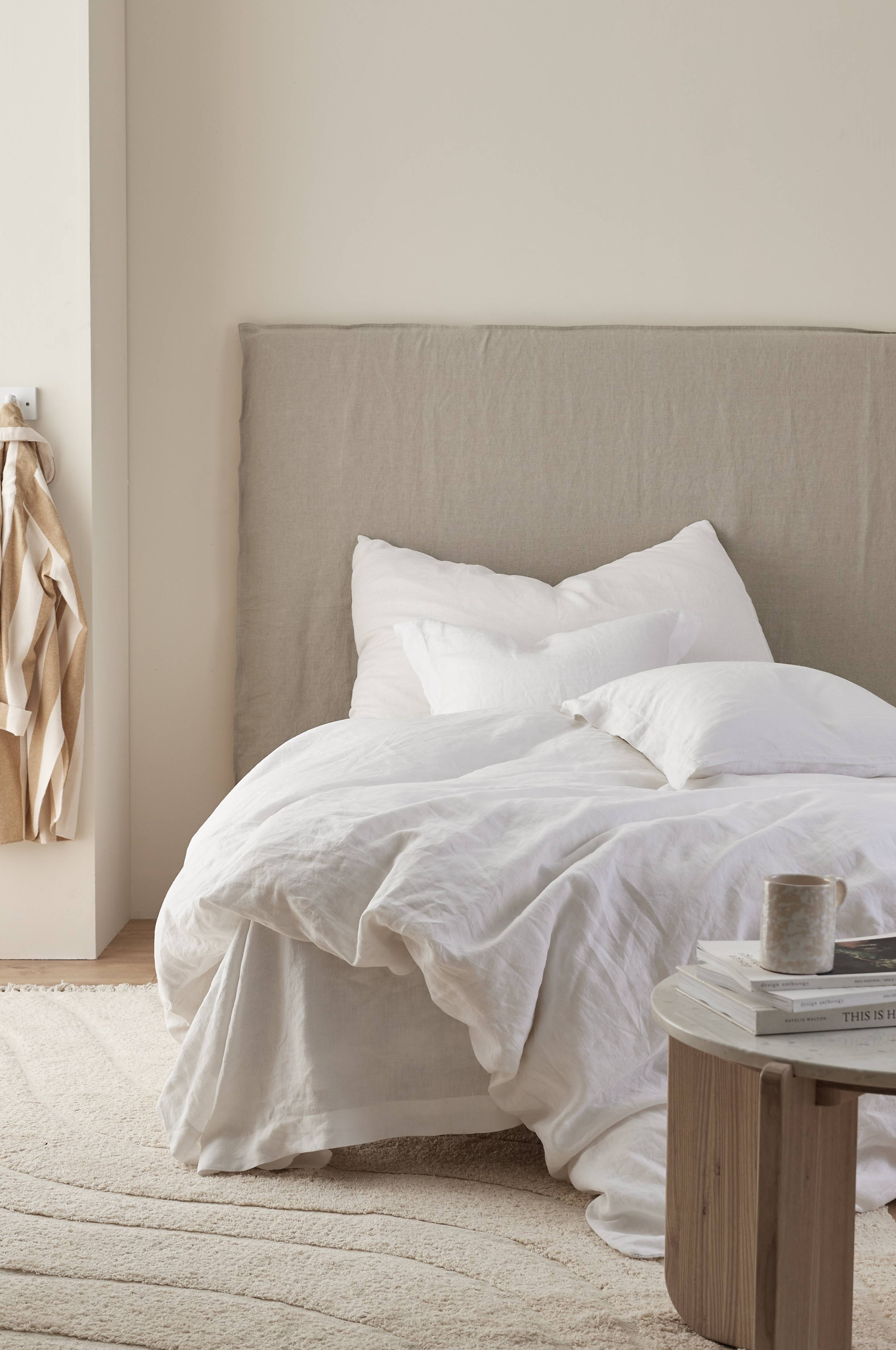 Et betræk i hør, som du trækker over din sengegavl. Betrækket har løs pasform, afhængigt af hvor dyb din sengegavl er, og sengen får et afslappet udtryk. Dobbelte denimsømme på 3 sider. Betrækket er i en blød og behagelig vasket hørkvalitet fra Frankrig.