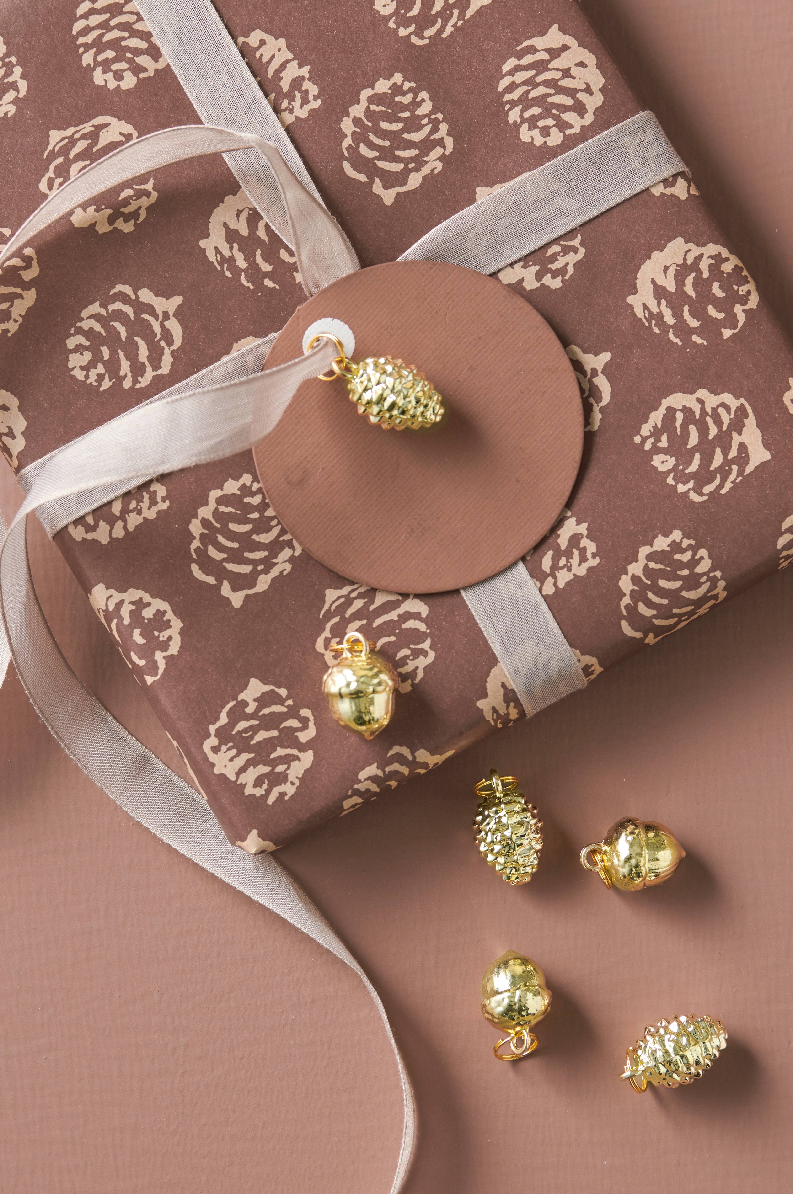 6 pakkedekorationer af guldfarvet metal. Højde ca. 3 cm.