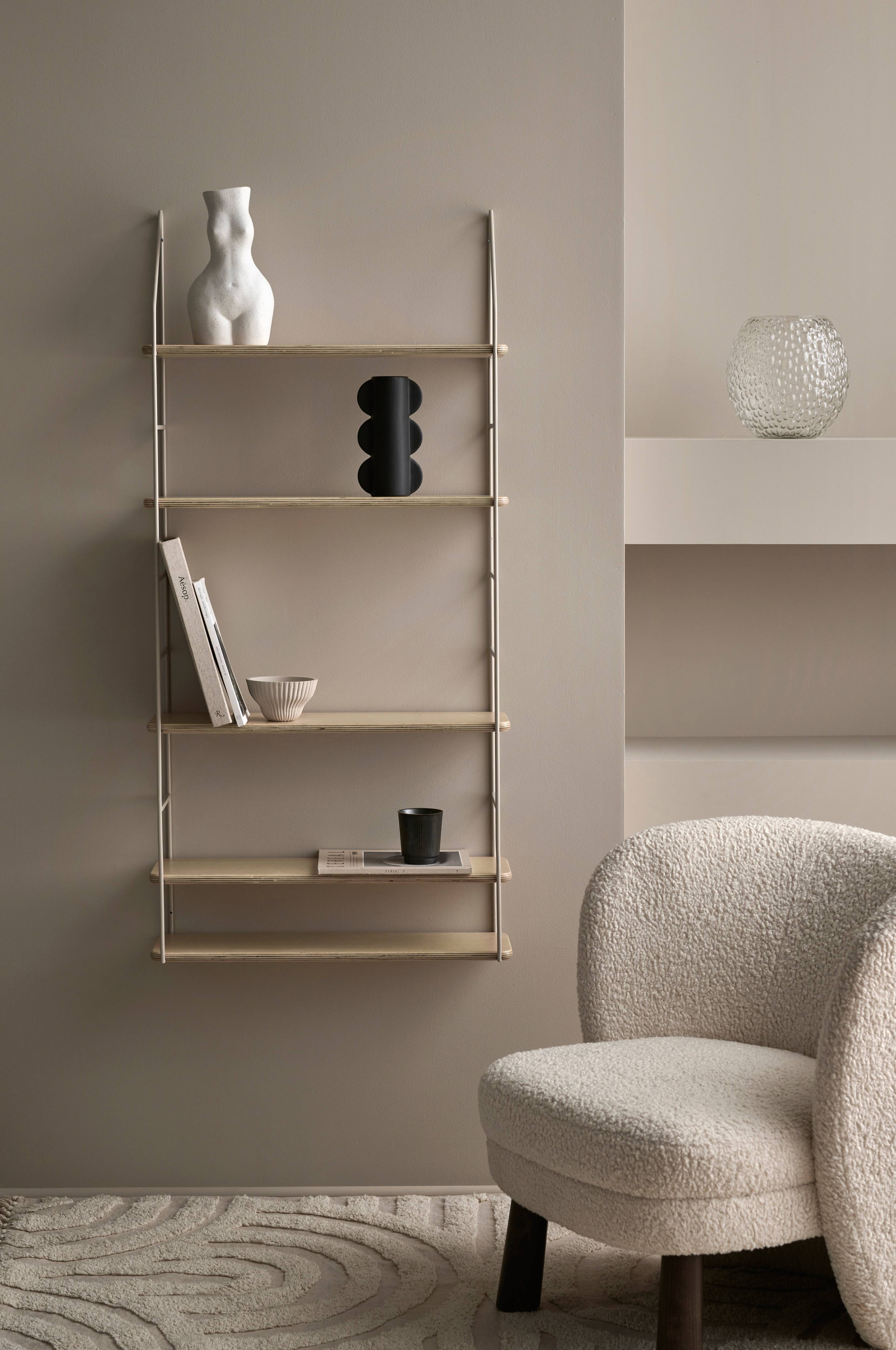 Væghylde af pulverlakeret metal med justerbare hylder i askfineret plywood. Hylden skrues fast på væggen. Leveres usamlet.