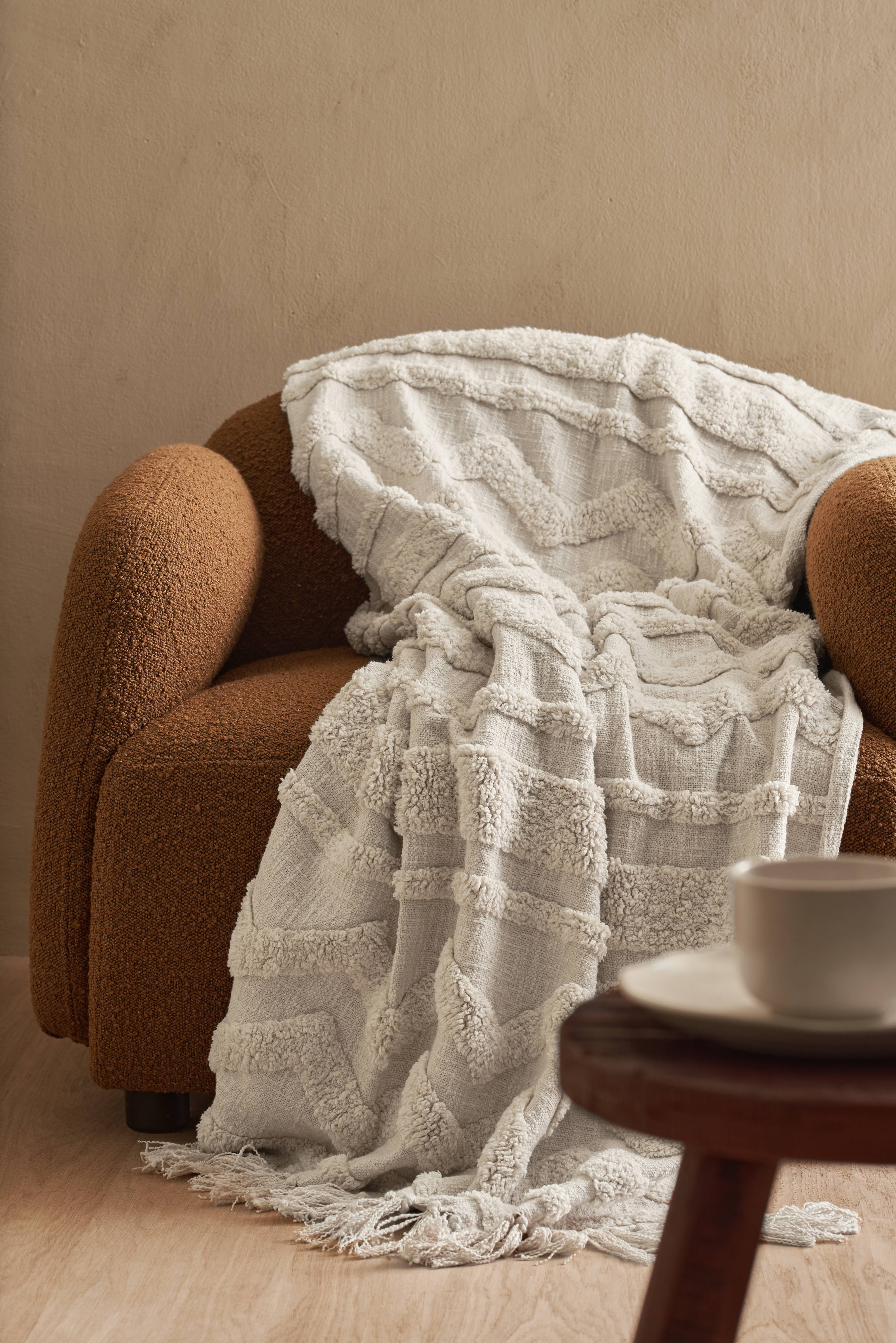 Plaid i lidt grovere bomuldskvalitet med struktur og knyttet mønster på forsiden. Frynser i enderne. Str. 130x170 cm + 8 cm frynser.