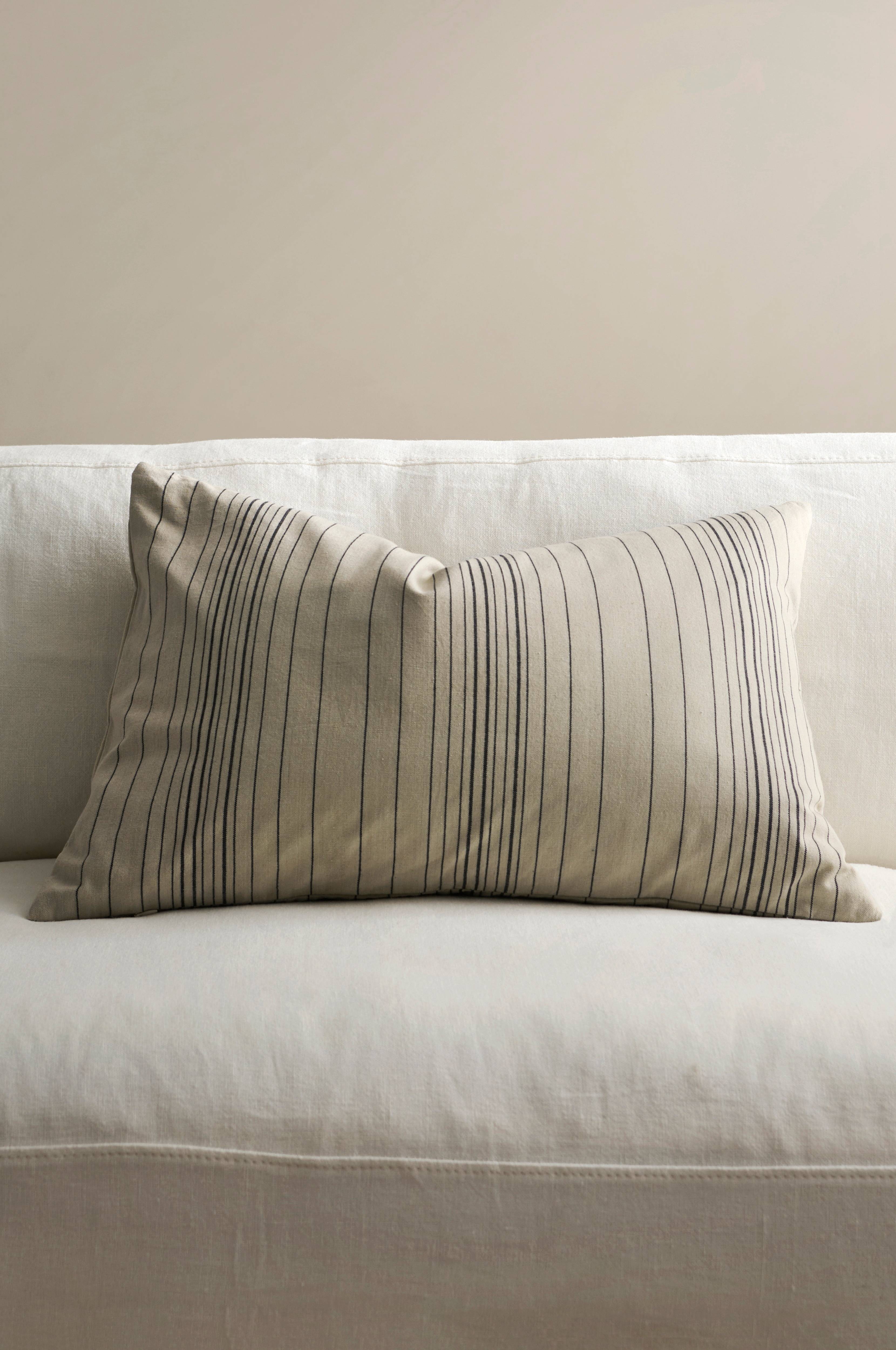 Pudebetræk i glatvævet bomuld med garnfarvet stribe. Lynlås i bunden.